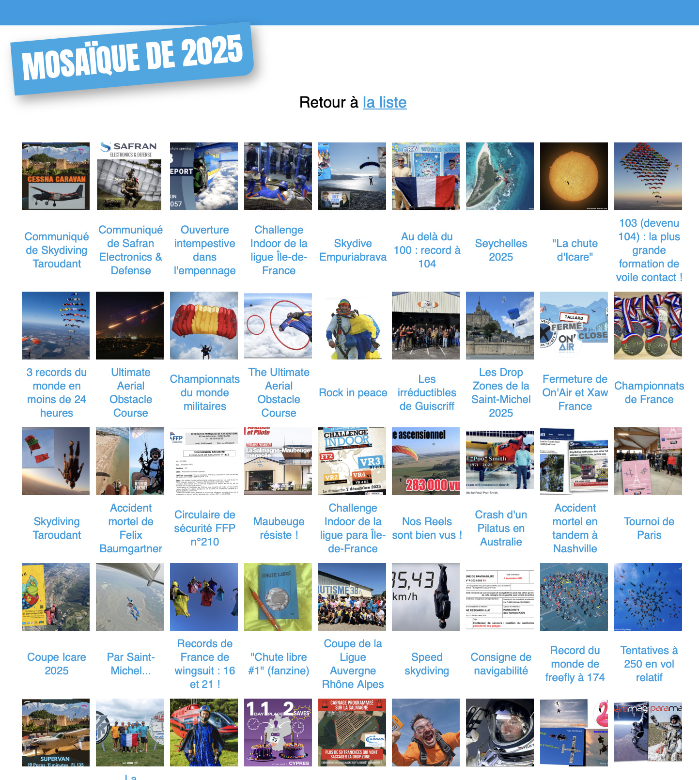 En plus du menu "Choisissez une année", nous avons ajouté un menu "Choisissez un mois" et "Mosaïque de l'année". Ce nouveau menu permet de voir d'un seul coup d'oeil tous les articles de l'année avec leur photo d'intro.