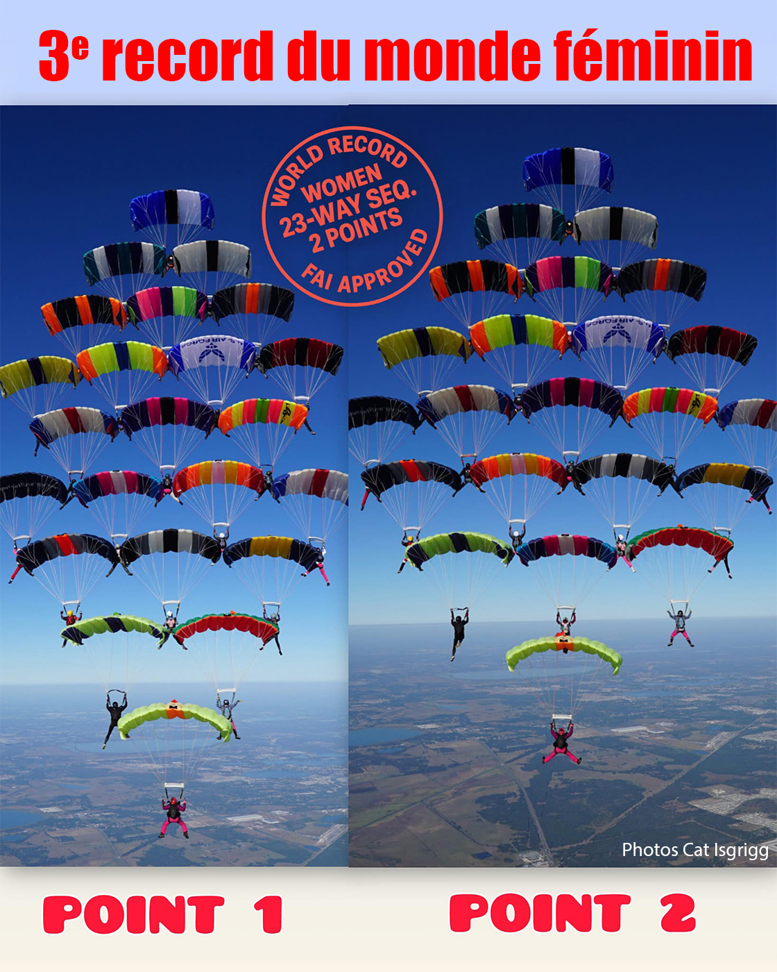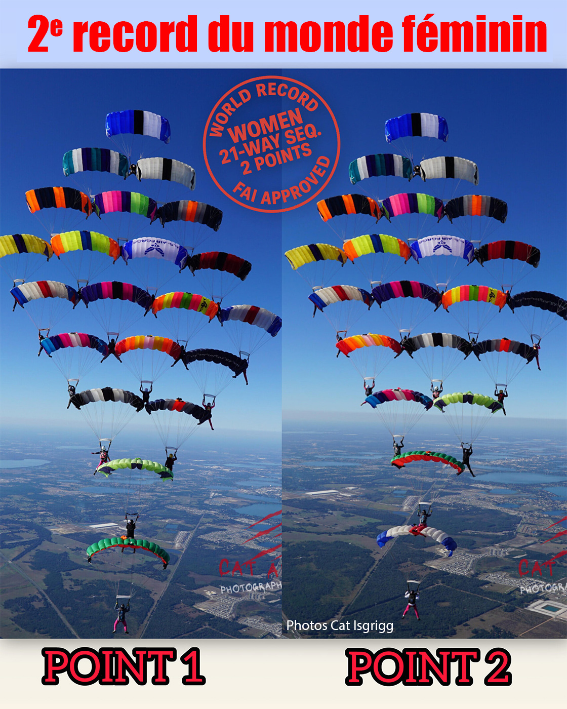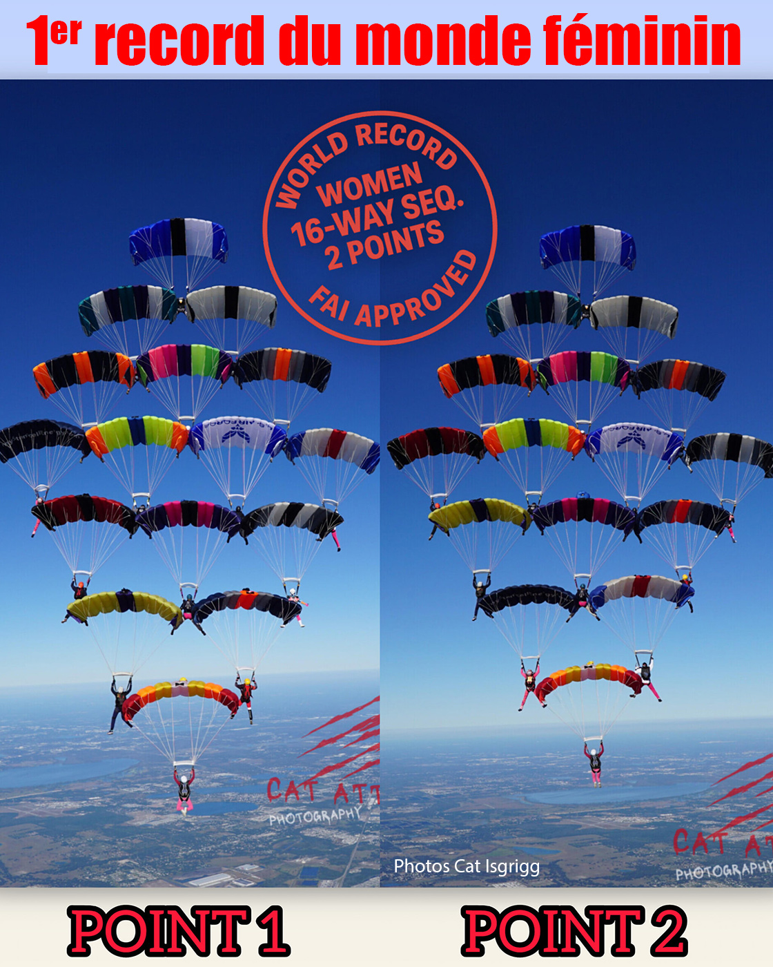Le jeudi 13 novembre, dès leur première tentative, et dès le deuxième jour de l’événement (prévu sur trois jours et juste avant les premières tentatives de record à 107), les parachutistes féminines signent un record du monde séquentiel de 2 points à 16, immédiatement recevable par la FAI*.