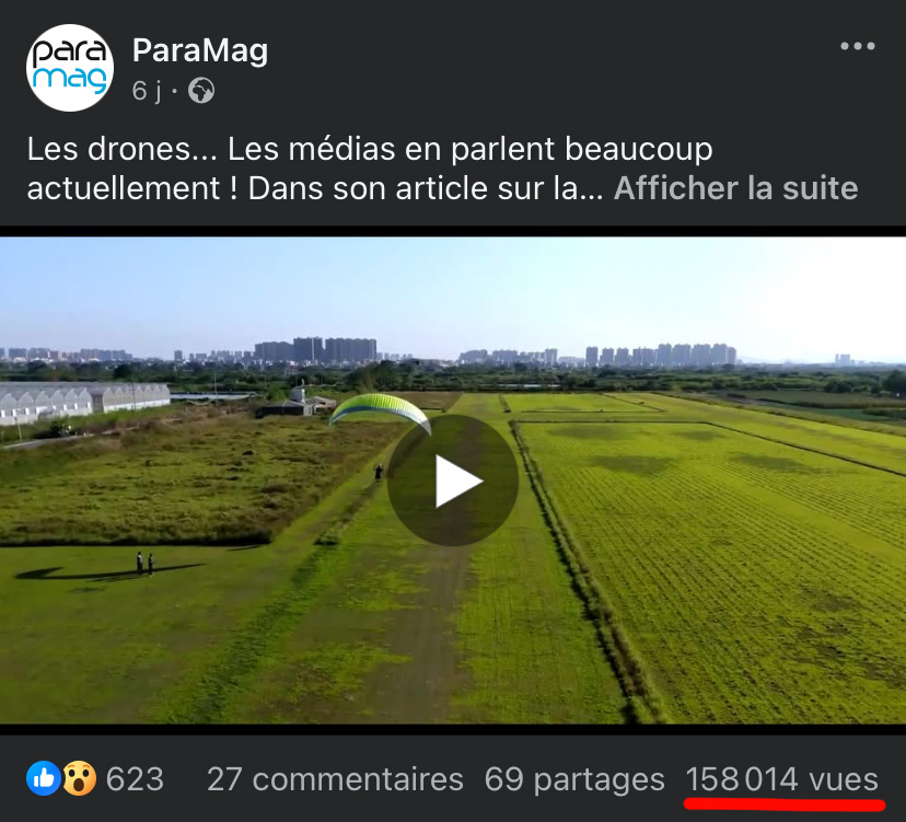 La viralité du deuxième sujet, le vol ascensionnel tracté par drone, est encore plus surprenante avec plus de 158.000 vues* en seulement 6 jours ! Et elle provoque le même type de réflexion. Sauf qu'ici il n'y a pas d'images spectaculaires, pas de montage particulier (un seul plan séquence de 16 secondes sur une seule musique sans transition) c'est donc assurément le sujet qui marque les esprits. Un sujet qui a provoqué certains commentaires intéressants sur notre page Facebook ParaMag, et dans diverses langues.