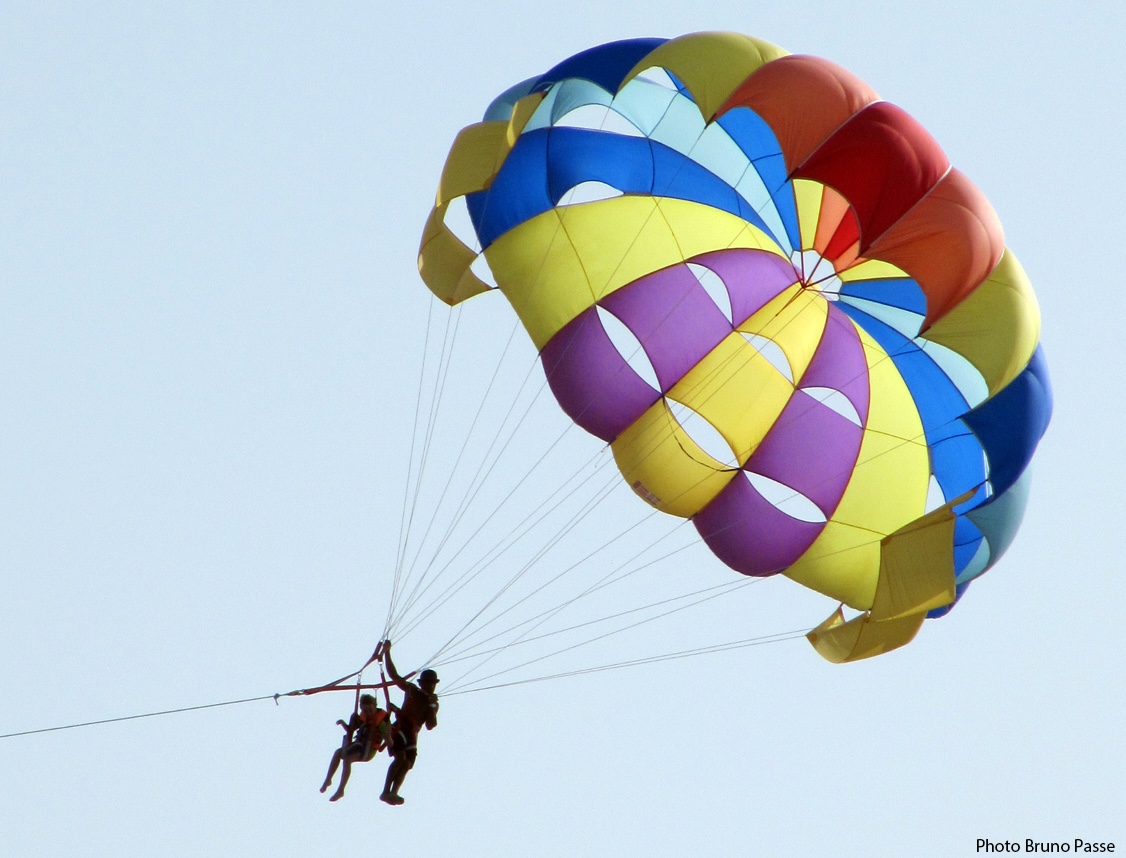 Pour conclure, saisissons l'image du parachute ascensionnel nautique, qui est certainement la plus connue du "grand public" : c'est celui qui est tiré derrière un bateau, en mer (ou sur plan d'eau), depuis la plage, pour les touristes, et qui est de forme "ronde", on dit "hémisphérique" dans le langage parachutiste. Ce parachute-là n'a pas de "caissons" comme les ailes de parachute et de parapente : il vole grâce à ses tuyères, ces espèces de fenêtres, d'ouvertures dans les panneaux du parachute.