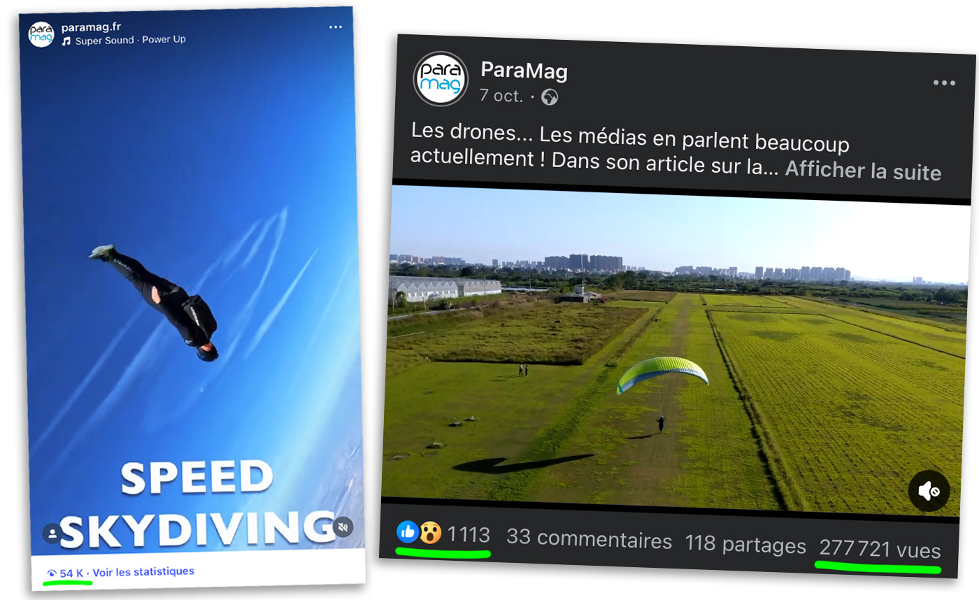Quelle joie de constater les résultats obtenus sur nos réseaux sociaux avec ces deux vidéos au format "reel" : +54.000 vues pour le speed skydiving et +277.000 vues pour le drone ascensionnel ! Car à l'échelle d'un média spécialisé et 100% dématérialisé comme ParaMag, ils sont pleinement satisfaisants.