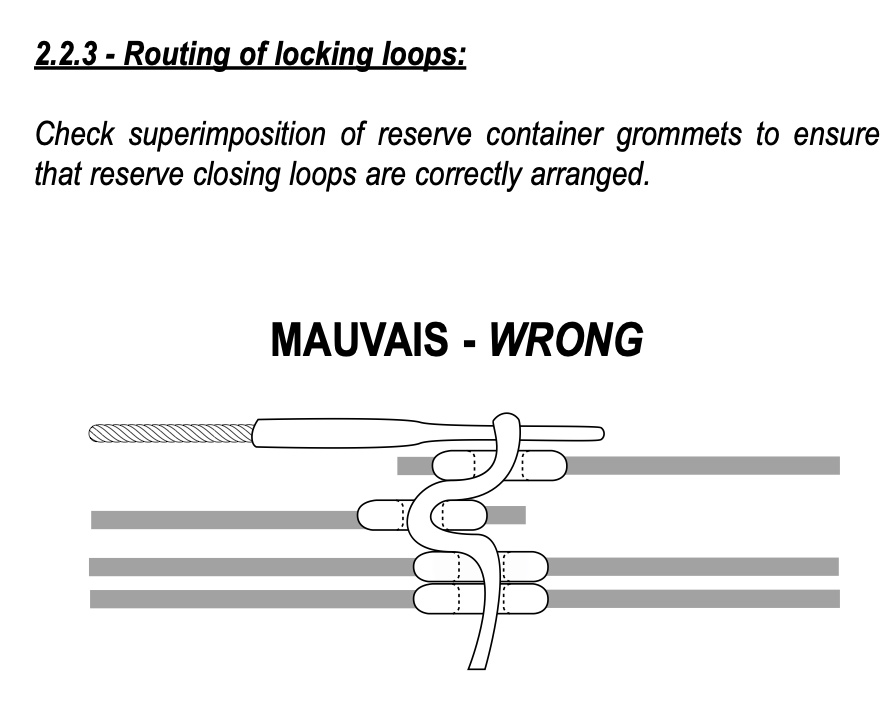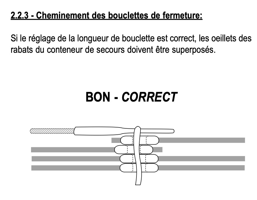 Illustrations ci-dessus : Extraits d'un manuel constructeur (qui n'est pas Aerodyne) et qui démontre l'importance de la longueur et du réglage de la bouclette de fermeture du secours.