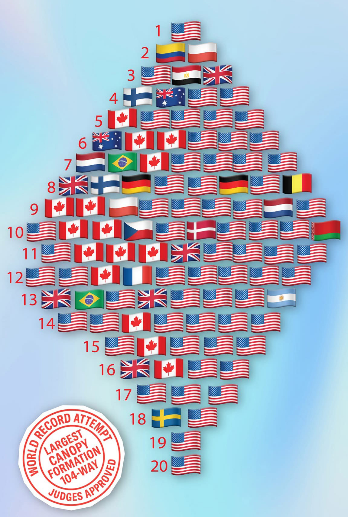 La répartition des nations dans le record à 104 : chaque participant est représenté par le drapeau du pays qu'il représente (on vous laisse deviner où se trouve Sean Paquette dans la formation). Illustration CRW World Record