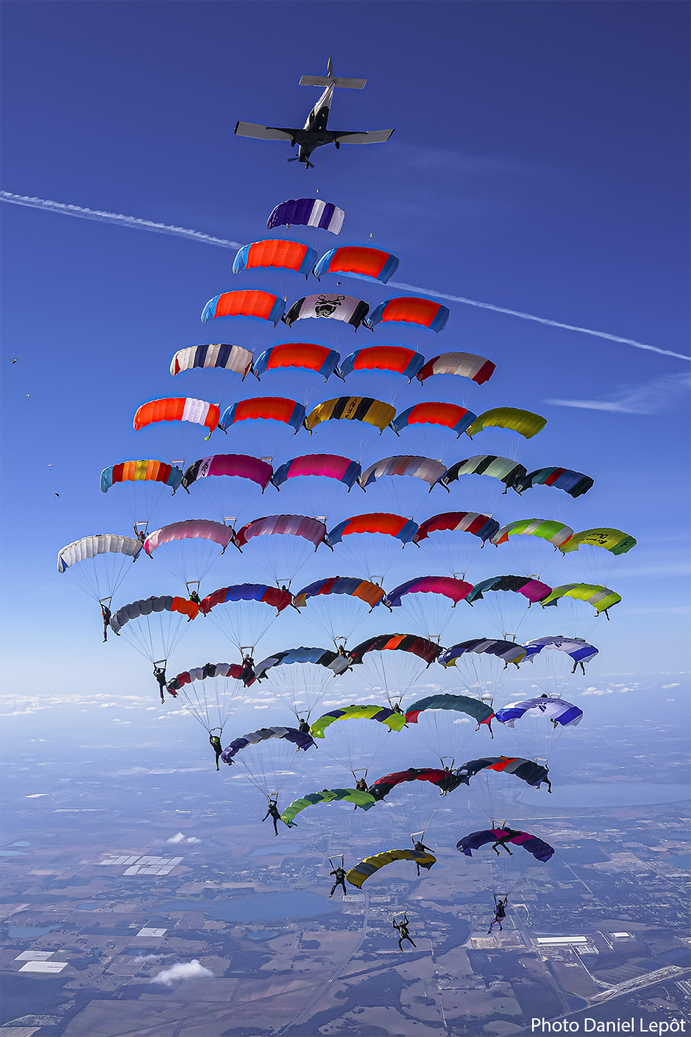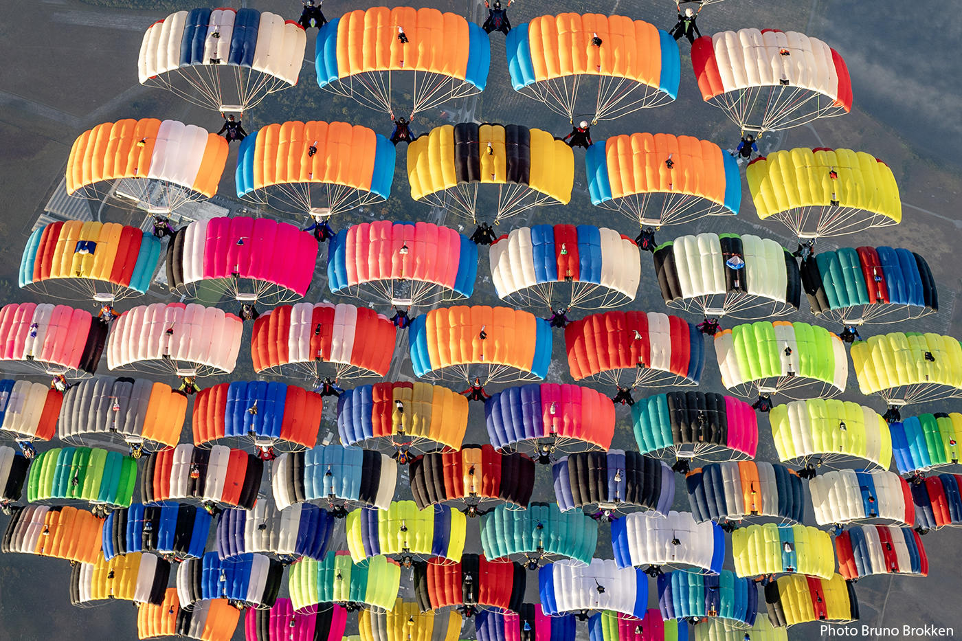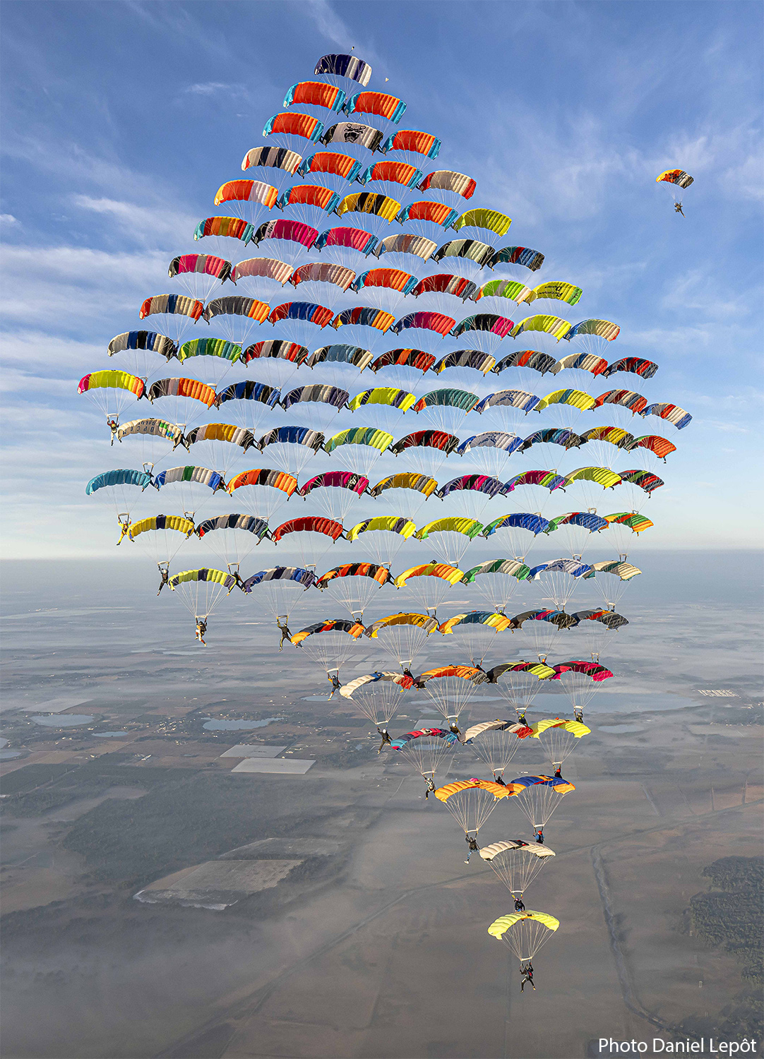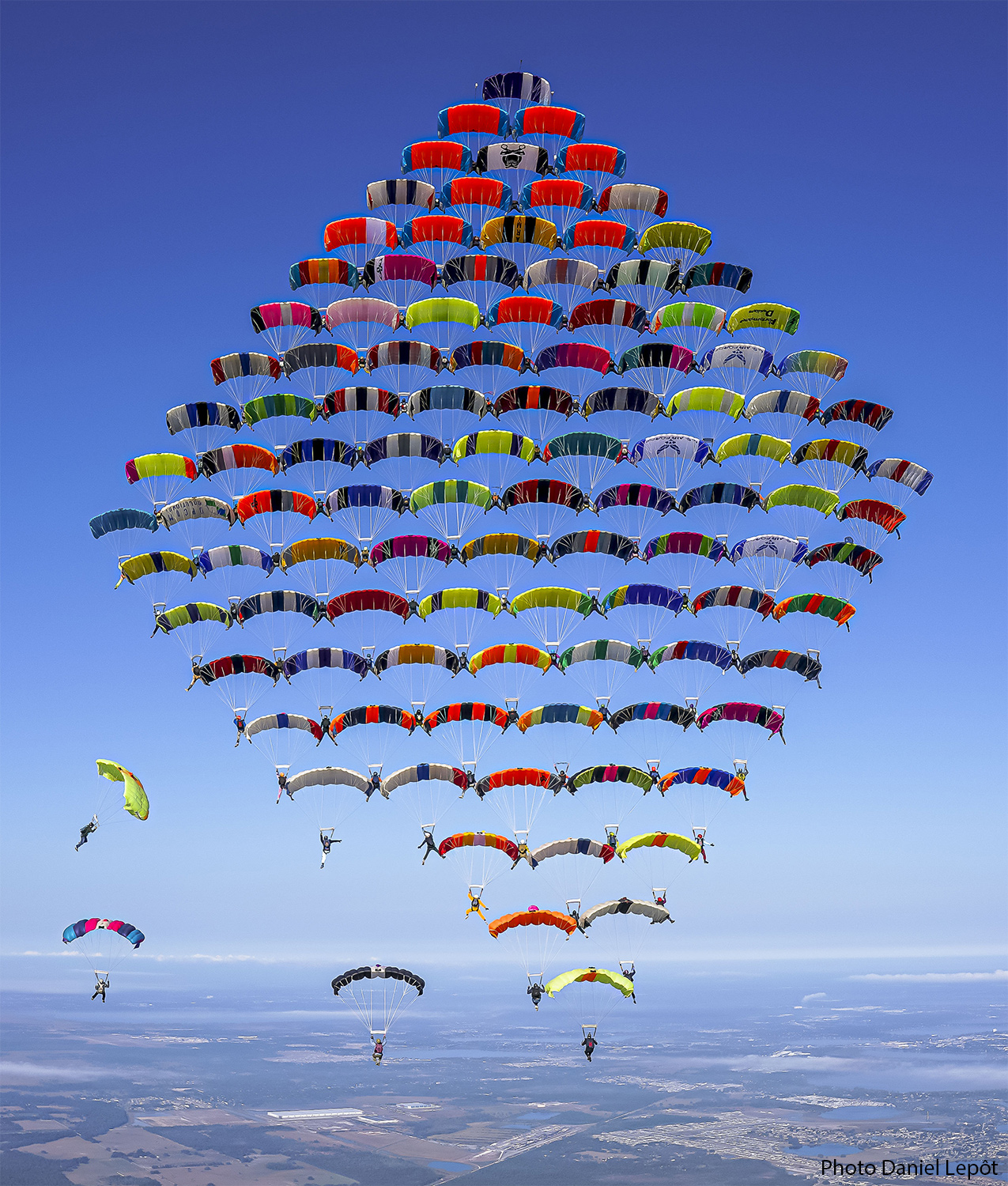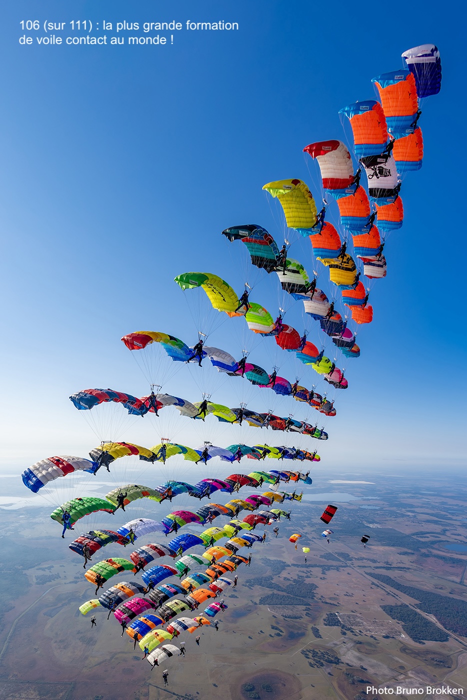Ceci est la plus grande formation de voile contact au monde : 106 parachutistes accrochés. Mais elle ne peut pas être un record officiel, car l'objectif était une formation à 111. Photo Daniel Lepot