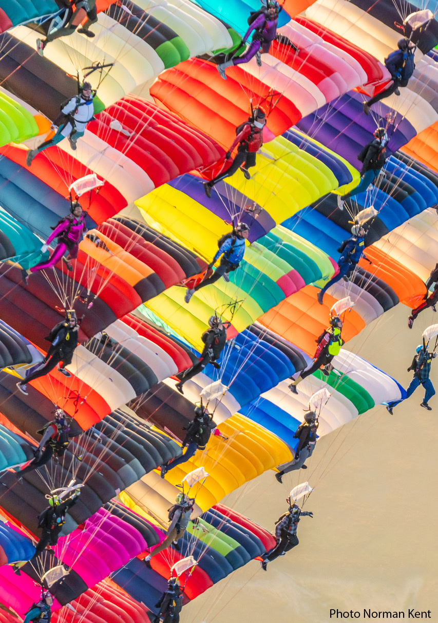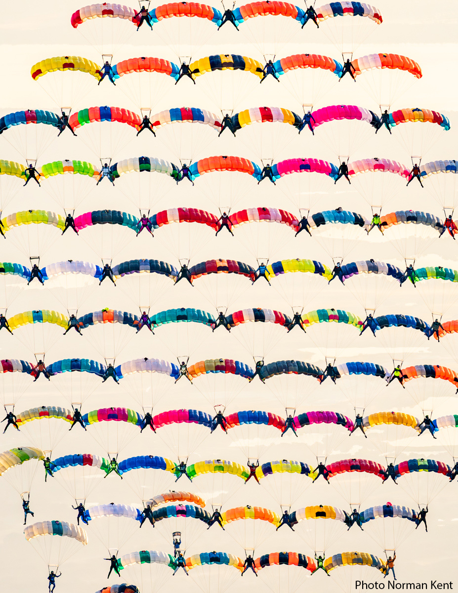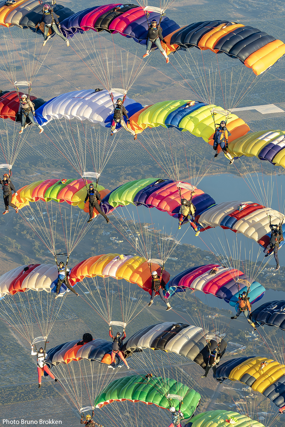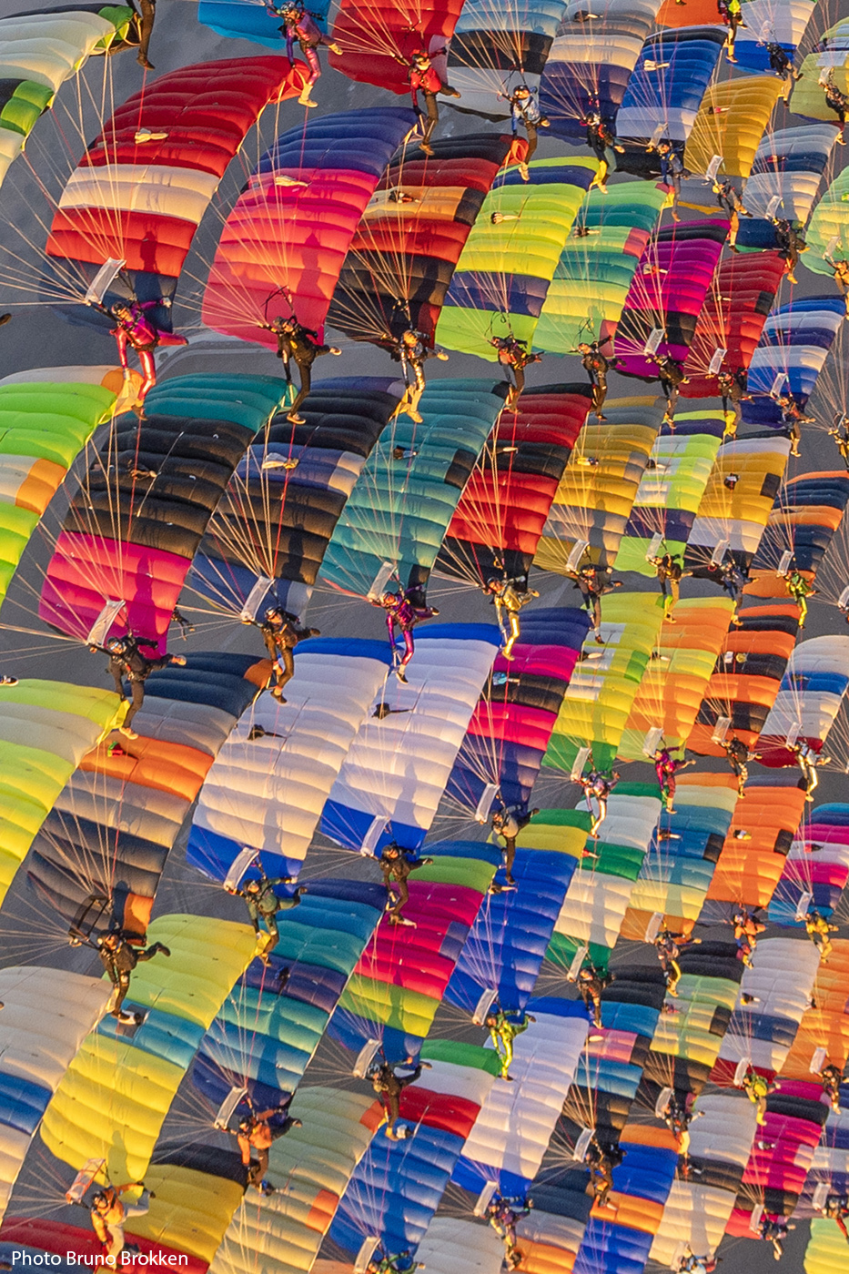 Pour moi, ce fut une expérience fantastique de voler aux côtés de ce groupe de parachutistes acrobatiques extrêmement talentueux et dévoués. Quel privilège d'avoir pu les accompagner dans les airs et immortaliser leurs magnifiques performances ! Sur le plan personnel, l'une des choses que j'apprécie particulièrement dans ce genre d'événement, c'est que je donne le meilleur de moi-même lorsque je photographie les meilleurs ! J'aime ressentir l'énergie qui m'entoure, ajuster et modifier mon plan de prise de vue en fonction de mes impressions, de mon ressenti et de mes intuitions.