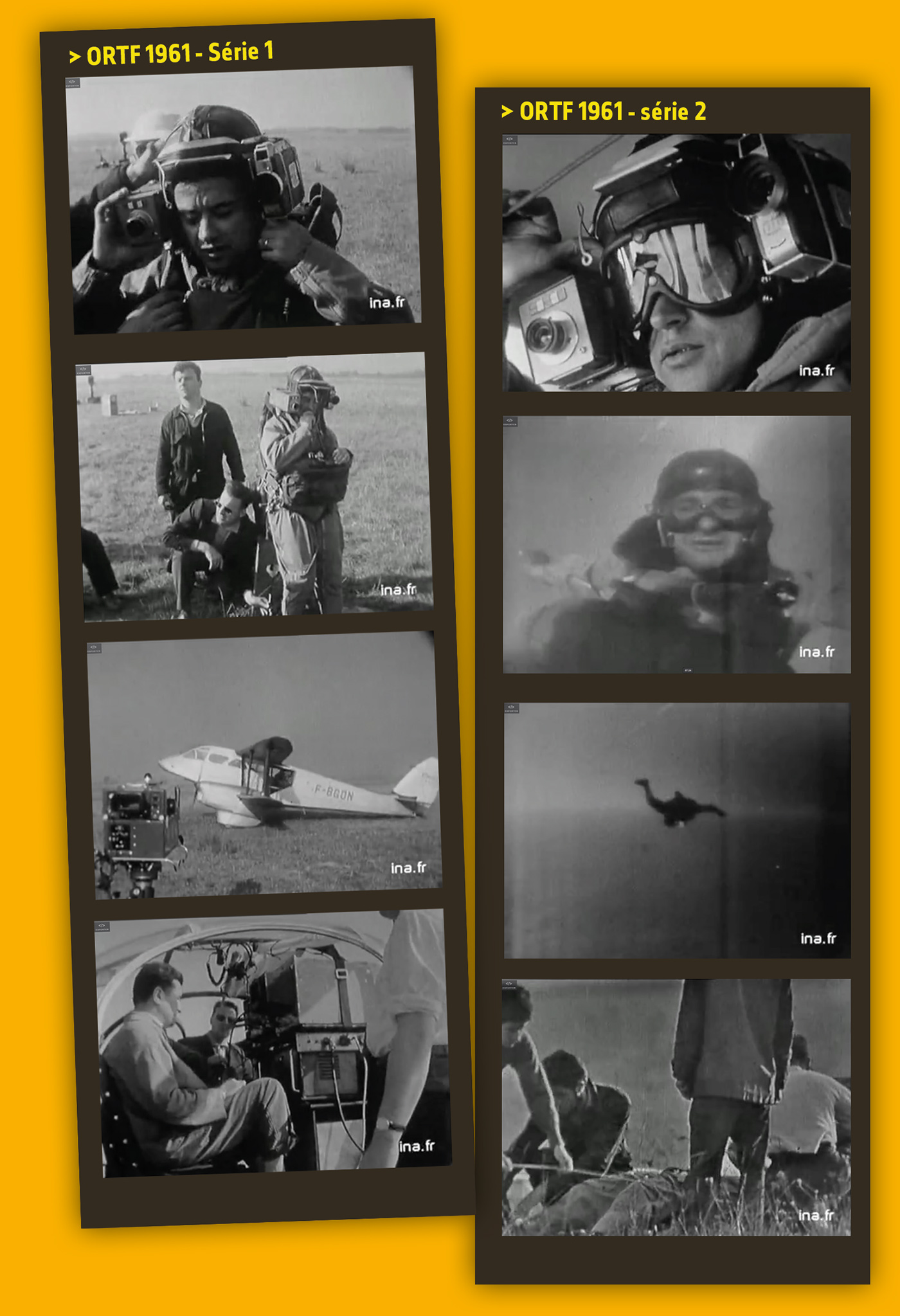 En 1961, séquences de la première prise de vue vidéo en chute libre, pour l'émission "5 colonnes à la Une". Cliquer sur l'image pour visionner l'exploit archivé par l'INA.