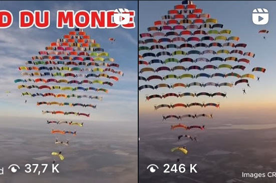 En deuxième position des reels les plus vus en 2025, on trouve le record du monde de grande formation en voile contact avec 246.531 vues. Du "vrai" parachutisme, disons-le, et donc un résultat qui reflète mieux nos performances en matière de publication spécialisée. Et si l'on ajoute les 37.728 vues d'un deuxième reel sur le même sujet, cela fait un total de 284.259.