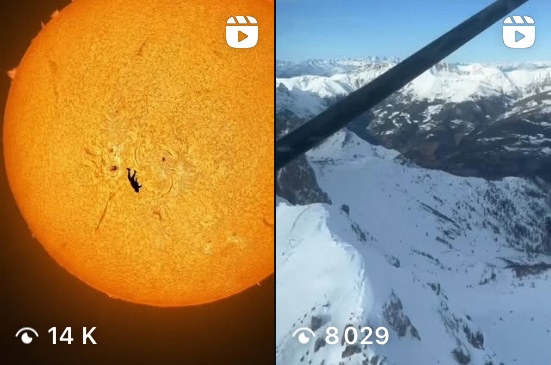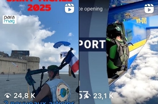 Une particularité s'affiche sur notre fil avec le reel du Para-club d'Aix "Débuter l'année en beauté" et ses images spectaculaires de parachutisme dans un paysage de montagnes enneigées : 8.029 vues, mais qui ne sont pas complètement les nôtres puisqu'il s'agit d'une publication "partagée" avec le Para-club d'Aix, une excellente initiative de ce partenaire, une initiative à suivre.
