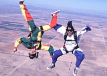 D'octobre à avril, l'Arizona offre ses plus belles journées. Les autres mois de l'année, le désert devient un four dès les dix heures du matin. Quotidiennement, le ciel bleu permet d'enchaîner à Eloy dix sauts sans problème, à raison d'un saut à l'heure et pour une poignée de dollars. De nombreux parachutistes Européens, Scandinaves ou Japonais ont compris que cet endroit leur permet de finir ou de commencer sérieusement leur saison en y totalisant une ou plusieurs centaines de sauts. Alors en mars dernier, il y avait de nombreux Français, d'autres Européens et quelques vedettes que nous rencontrons occasionnellement sur les terrains de l'exagone.