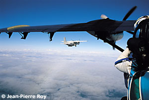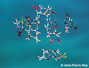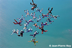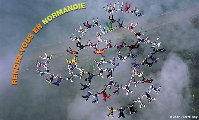 Suite à des retours désynchronisés à Bréville et une météo hasardeuse , la journée se termine par quelques sauts à 20 offrant des secondes de chute particulièrement délicieuses pour lun des groupes constitués de relativeurs habitués à la séquence de compétition. Dimanche matin, la barre nuageuse qui stagne au-dessus de la côte engendre lhésitation quasi générale au sein du groupe à 62. Au moment de partir à lembarquement, le front apporte sa bruine. Retour au hangar. Le week-end semble prématurément toucher à sa fin. Le Twin Otter repart vers lItalie provoquant le départ dune vingtaine de personnes. Le vent se lève et purifie le ciel offrant à ceux qui sont restés lopportunité de réaliser une jolie séquence de trois points à 38. Comme prévu, la bise souffle encore davantage, annonçant définitivement la fin de ce week-end en Normandie. Malgré une météo défavorable, les participants invités à la manip furent satisfaits des quelques sauts réalisés. La réussite dun 62 "à sec" fut très prometteur. Tous les relativeurs présents furent conscients du potentiel de ce groupe en regrettant simplement que le ciel ne leur ait que trop peu souvent ouvert son espace de jeu. Mais en écoutant les marins du port de Granville et dautres locaux, ce nest peut-être que partie remise. Lan prochain, la manip du Mont-Saint-Michel connaîtra éventuellement sa sixième édition | |||