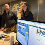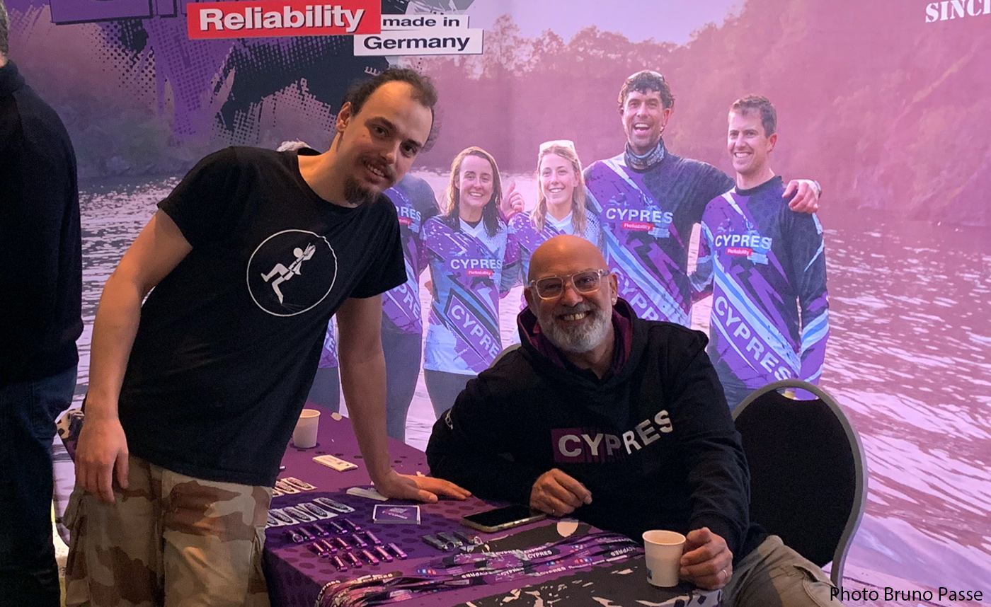 Sur le stand Airtec-Vigil, tenu par Damien Sorlin, Max Deversenne, plieur-réparateur des Hauts-de-France, au sein d'Espace Parachute.