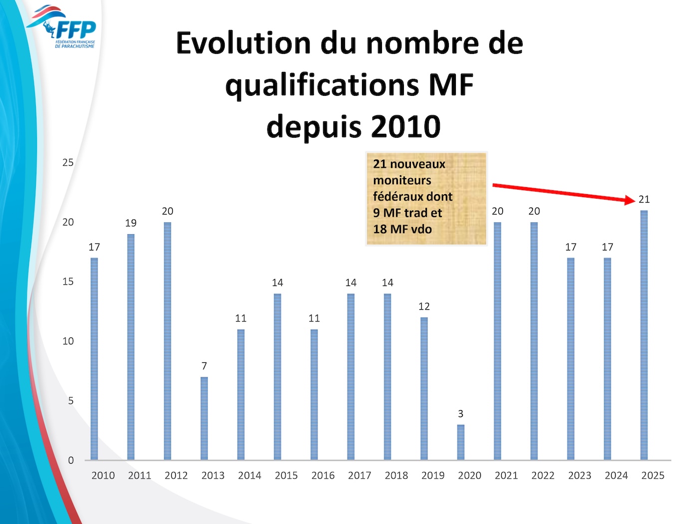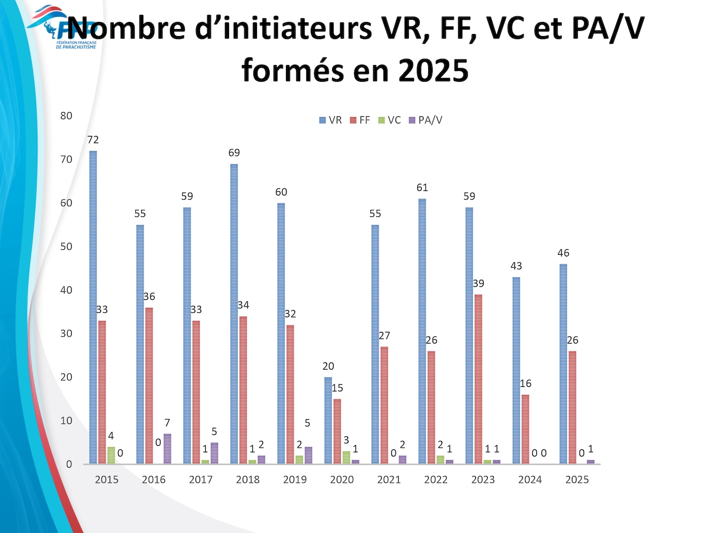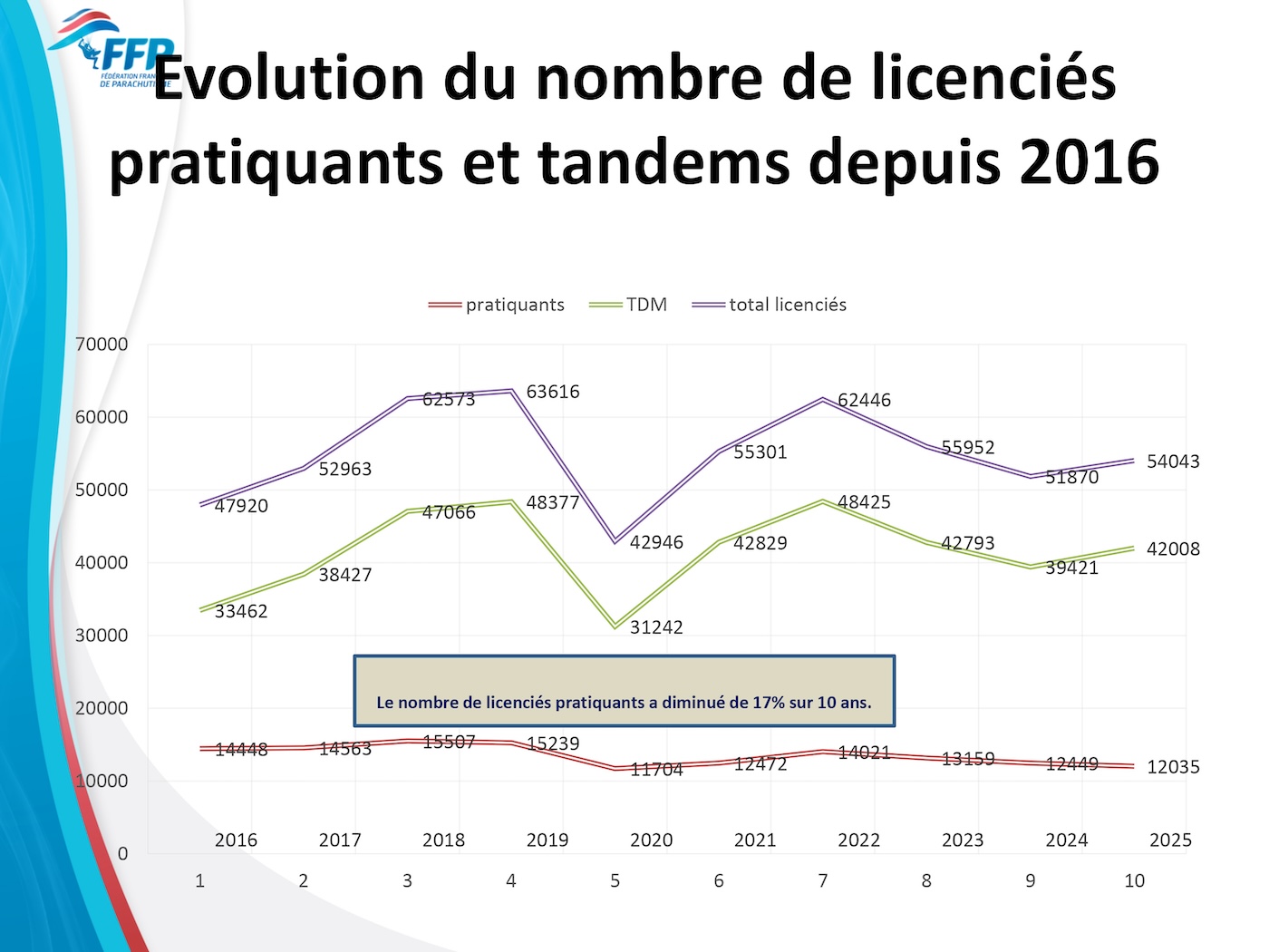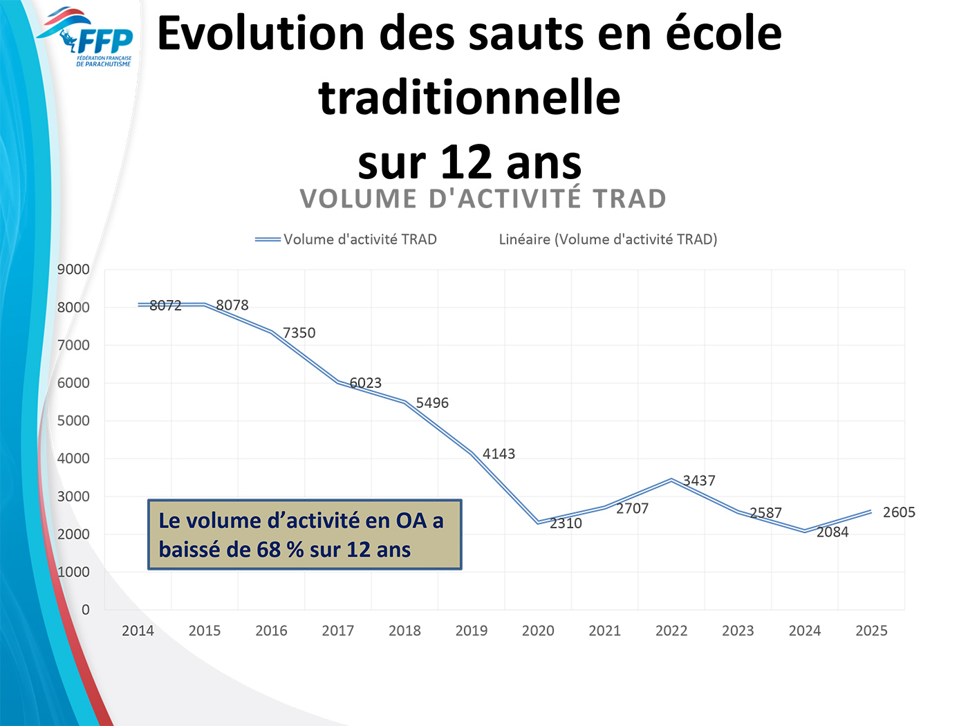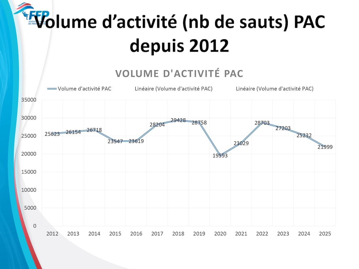 En 2025, selon les statistiques déclarées auprès de la FFP, il y a plus de licenciés (augmentation de 2780 licenciés par rapport à 2024), moins de sauts (diminution de 24.438sauts par rapport à 2024) et plus d'accidents déclarés (augmentation de 91 accidents par rapport à 2024). Il y a eu plus de relevés d'incidents également : 82 en 2025 contre 62 en 2024 (49 en 2023).