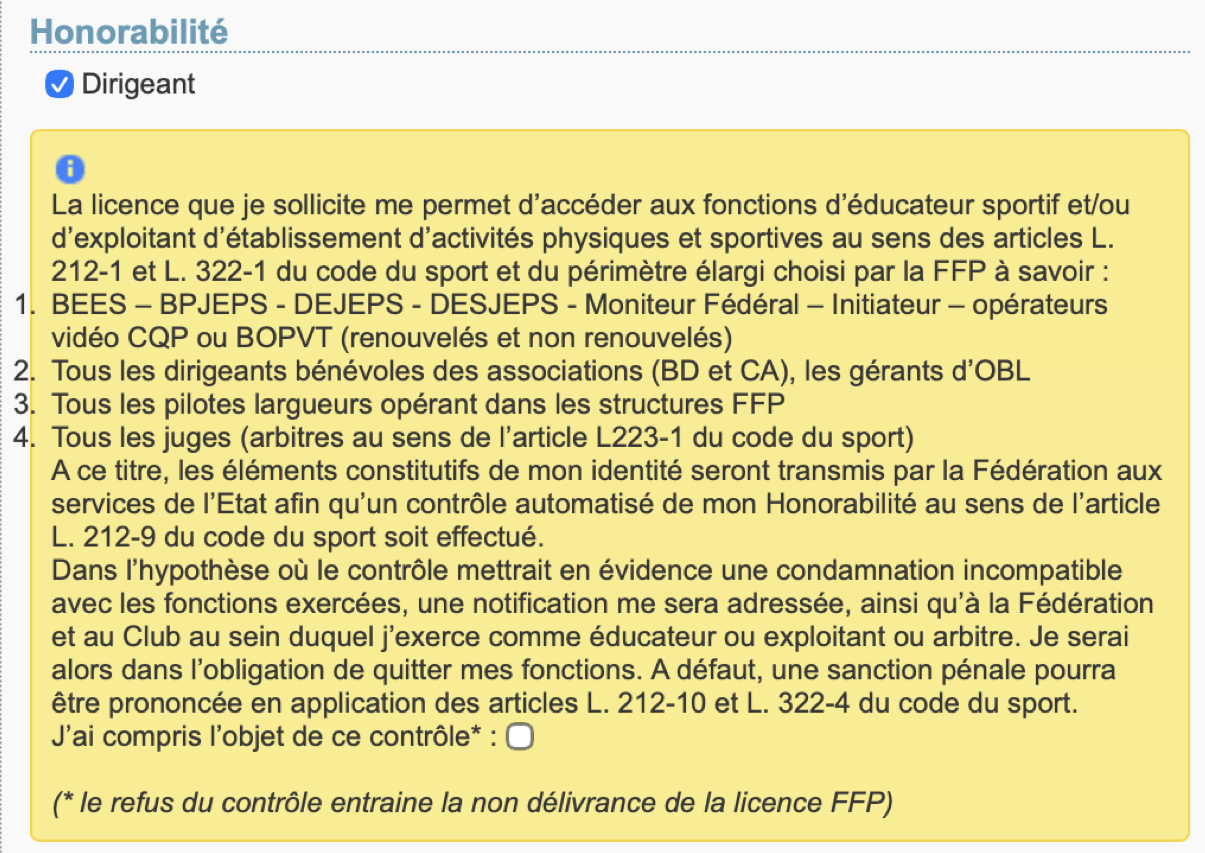 De nombreux pratiquants vont être concernés (ou l'ont déjà été) par cette notion d'honorabilité au moment de prendre leur licence FFP 2026. En fonction de la licence choisie, un nouvel onglet jaune s'affiche avec une case à cocher "J'ai compris l'objet de ce contrôle". Le refus entraine la non délivrance de la licence FFP.