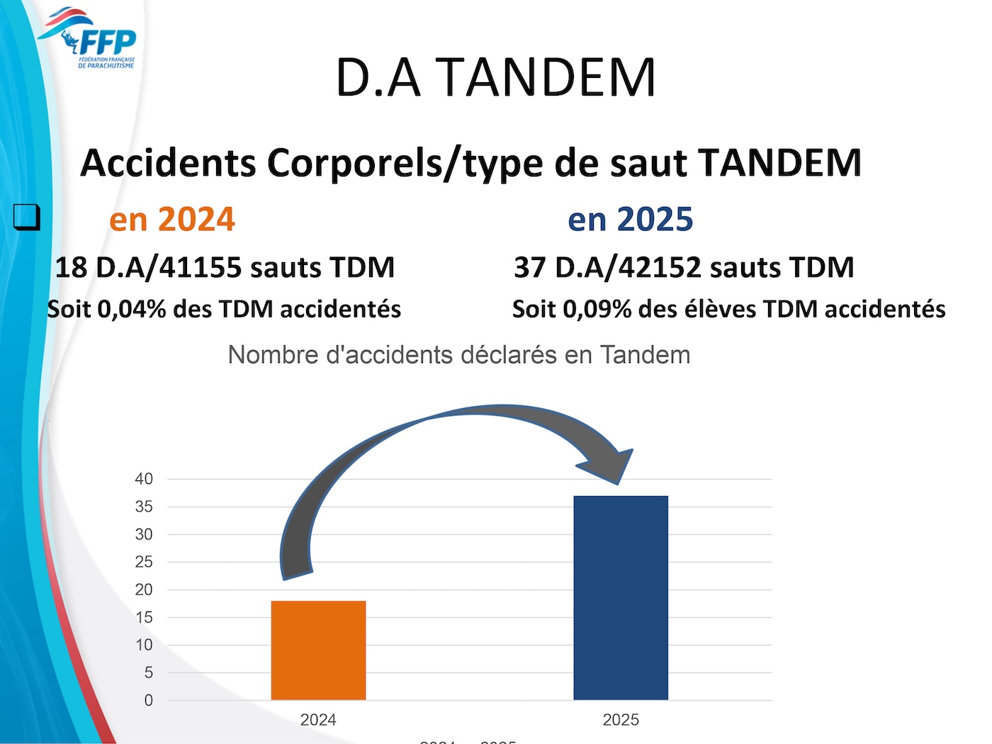 On observe aussi une augmentation des déclarations d'accidents corporels sur les sauts en tandem (voir schéma ci-dessous). En 2024, il y a eu 18 déclarations d'accidents pour 41.155 sauts en tandem, soit 0,04%. En 2025, il y a eu 37 déclarations d'accidents pour 42.152 sauts en tandem, soit 0,09%.