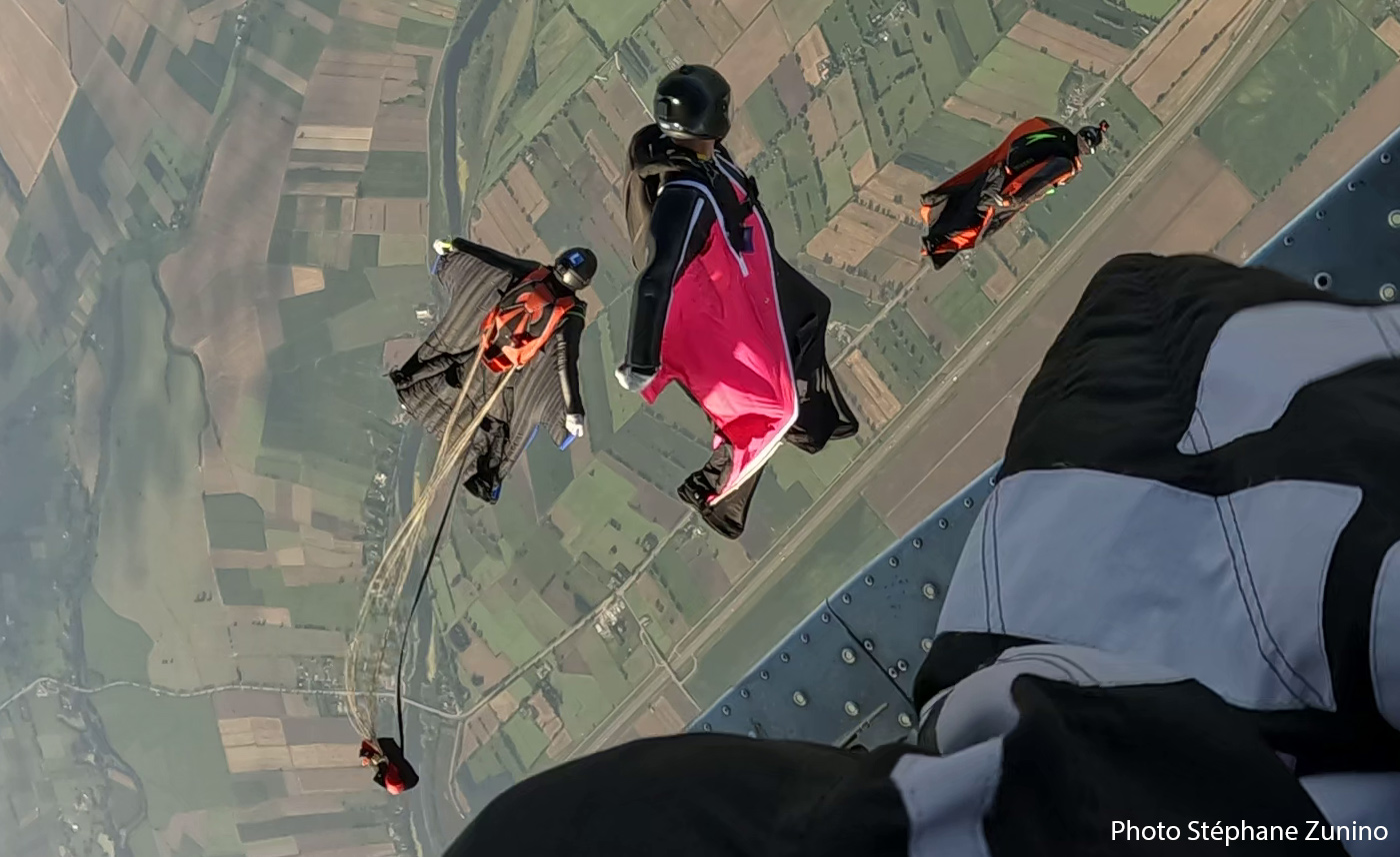 Ouverture intempestive en sortie d'avion durant un saut de groupe en wingsuit. Elle a été causée par une mauvaise mise en place en flotteur.