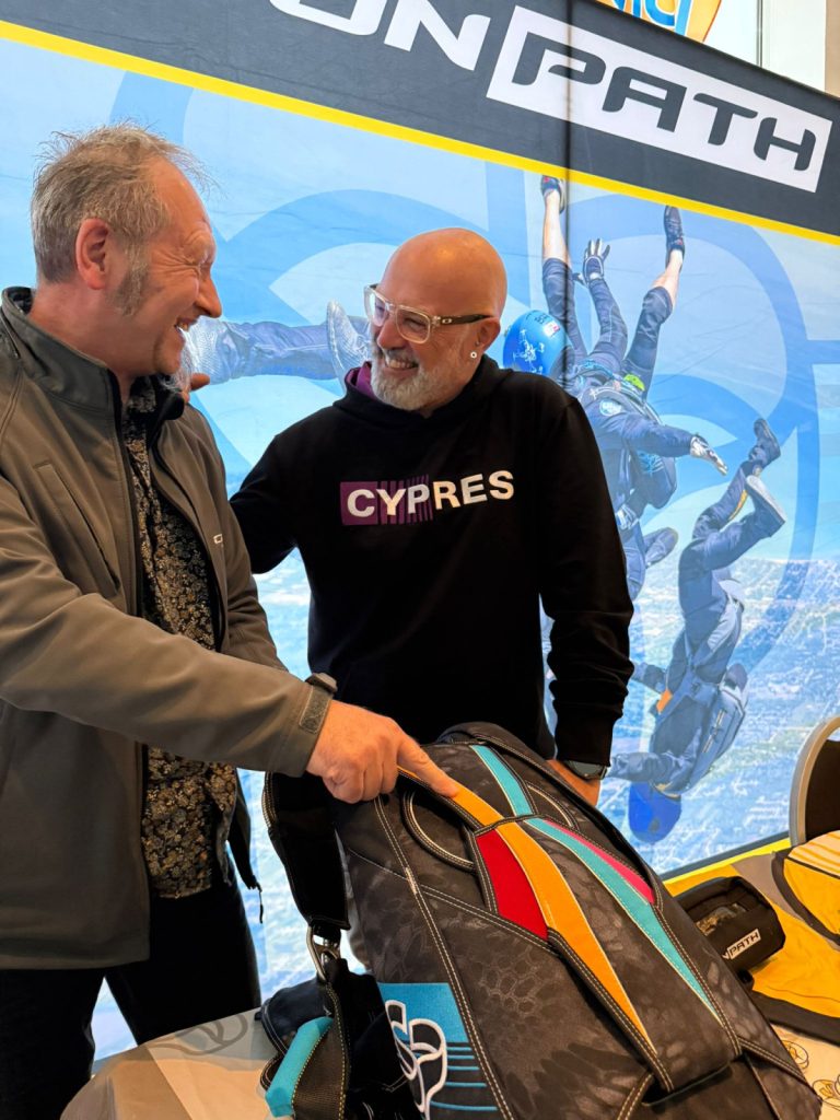 Sur le stand Airtec-Vigil, tenu par Damien Sorlin, Max Deversenne, plieur-réparateur des Hauts-de-France, au sein d'Espace Parachute.