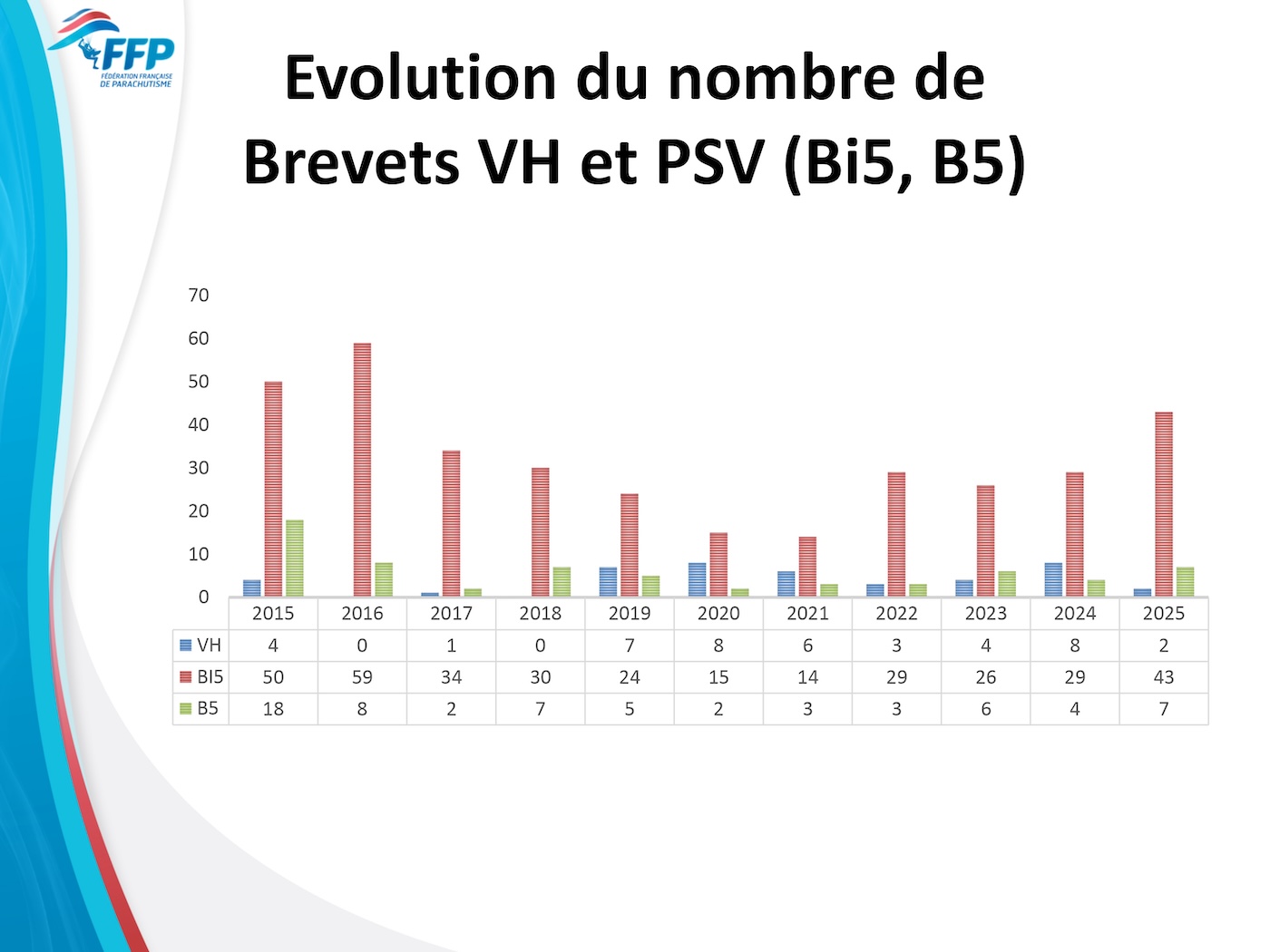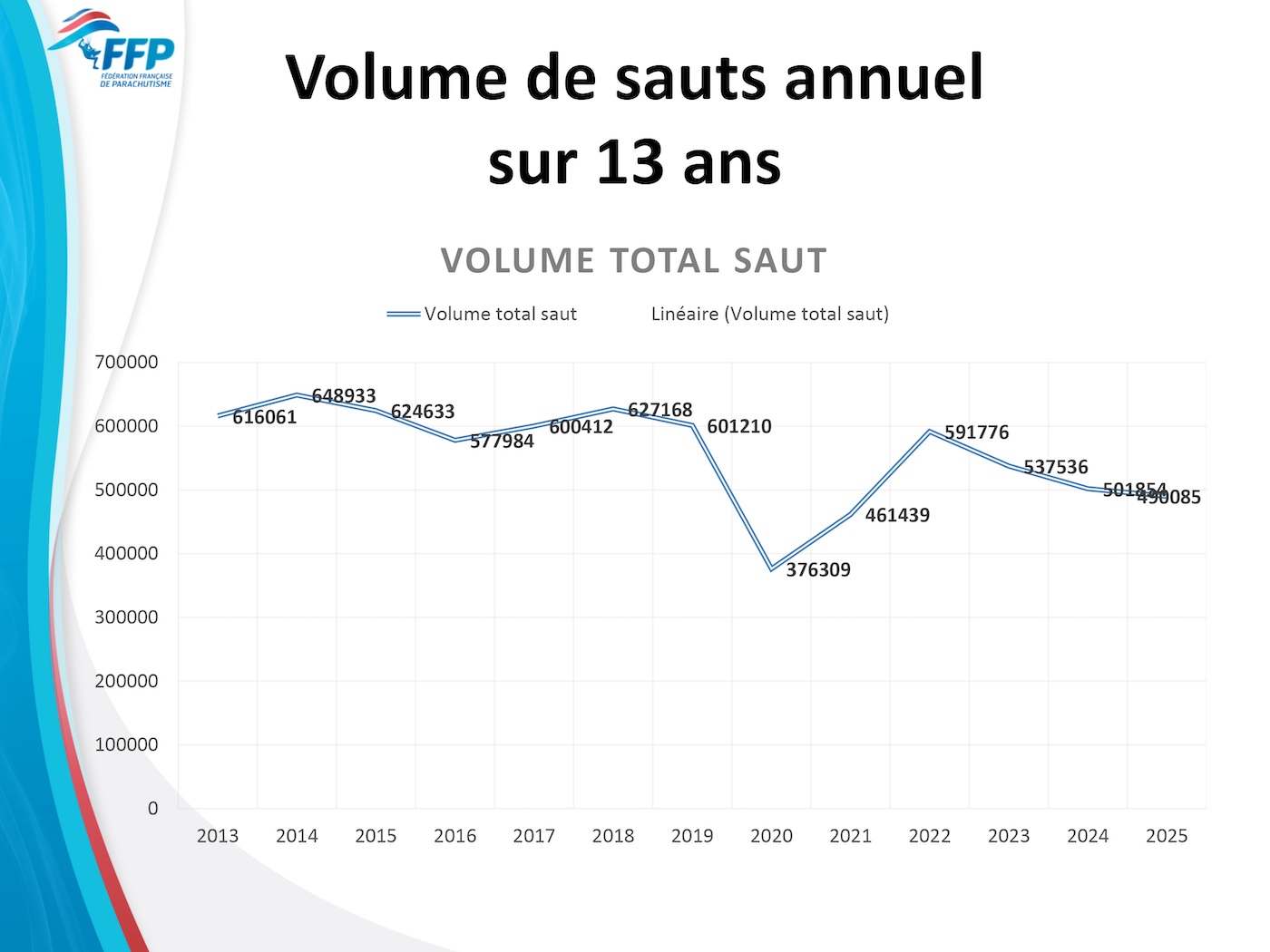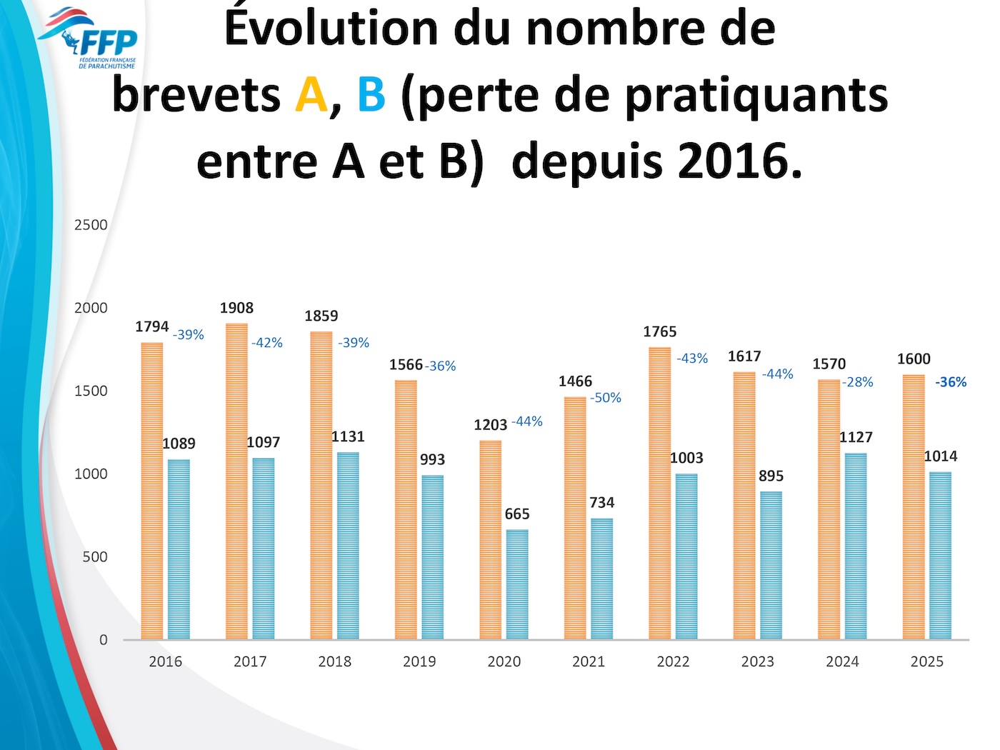 En 2025, selon les statistiques déclarées auprès de la FFP, il y a plus de licenciés (augmentation de 2780 licenciés par rapport à 2024), moins de sauts (diminution de 24.438sauts par rapport à 2024) et plus d'accidents déclarés (augmentation de 91 accidents par rapport à 2024). Il y a eu plus de relevés d'incidents également : 82 en 2025 contre 62 en 2024 (49 en 2023).