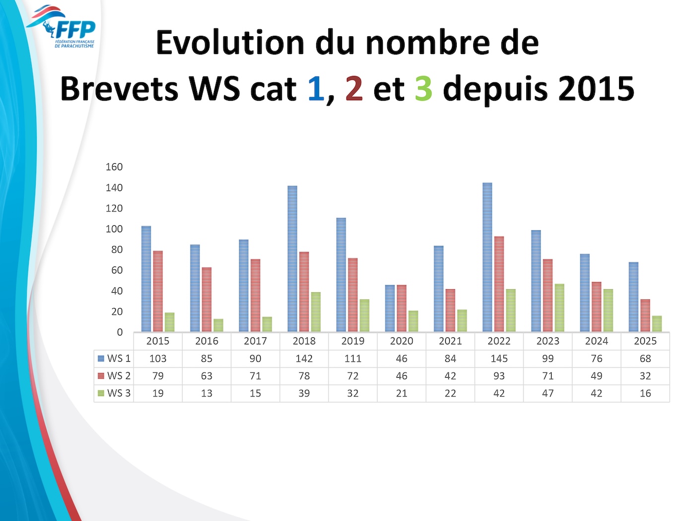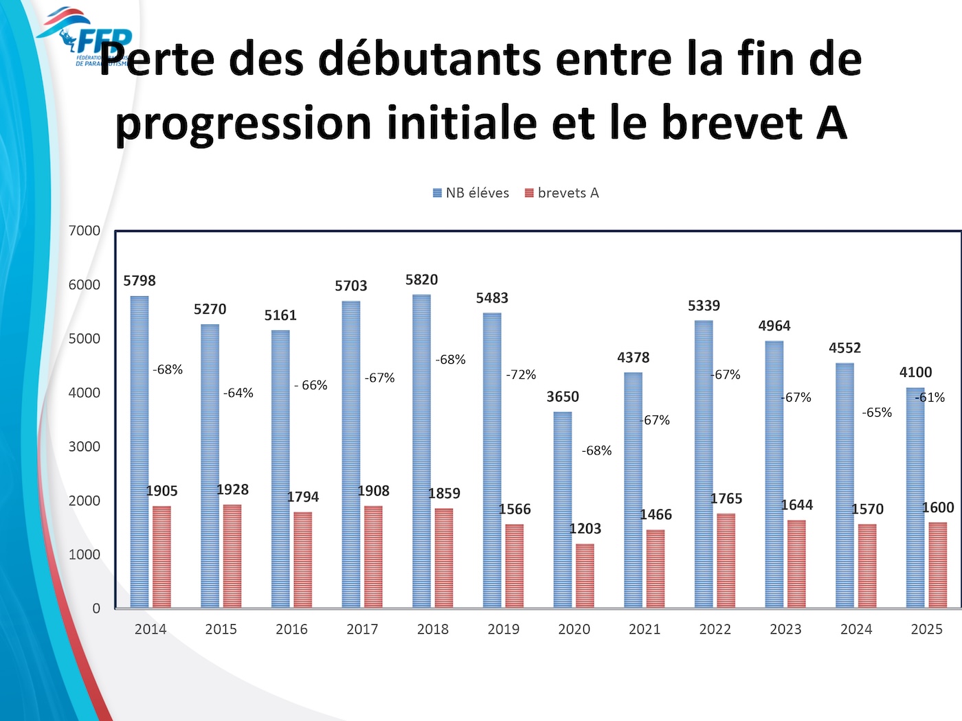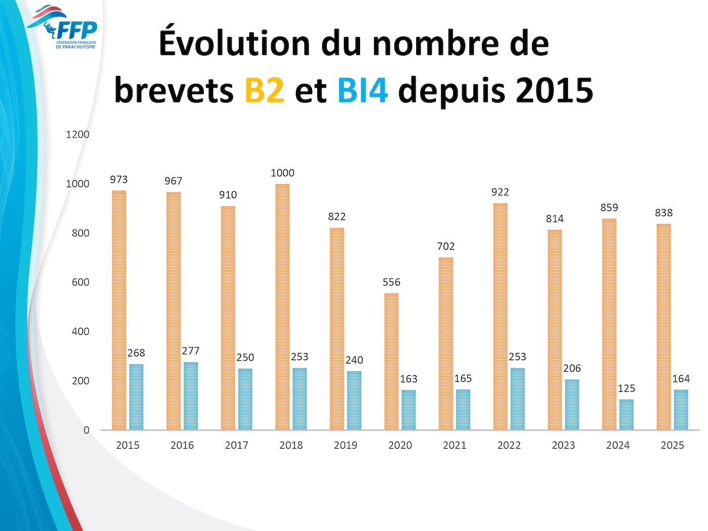 En 2025, selon les statistiques déclarées auprès de la FFP, il y a plus de licenciés (augmentation de 2780 licenciés par rapport à 2024), moins de sauts (diminution de 24.438sauts par rapport à 2024) et plus d'accidents déclarés (augmentation de 91 accidents par rapport à 2024). Il y a eu plus de relevés d'incidents également : 82 en 2025 contre 62 en 2024 (49 en 2023).