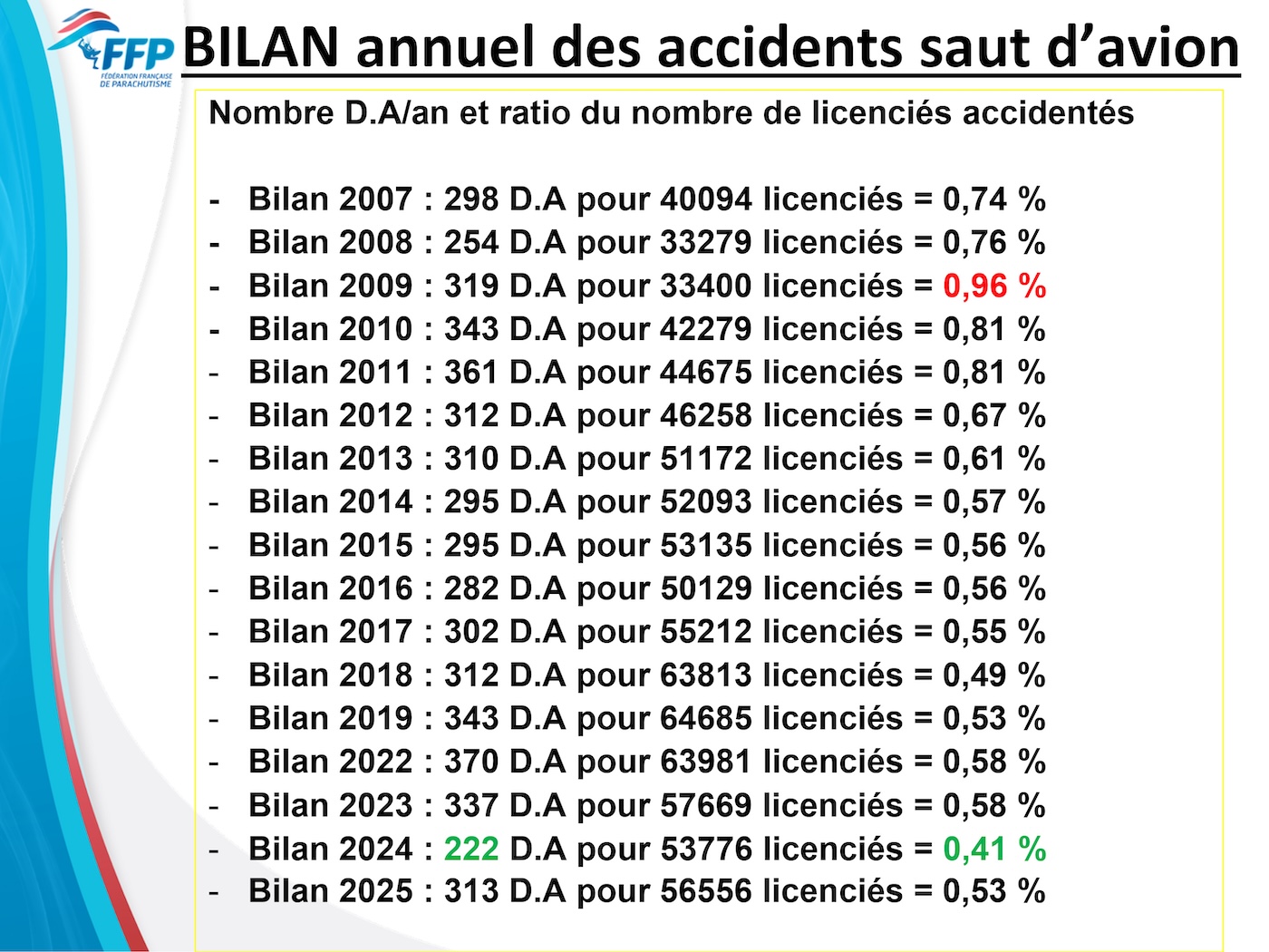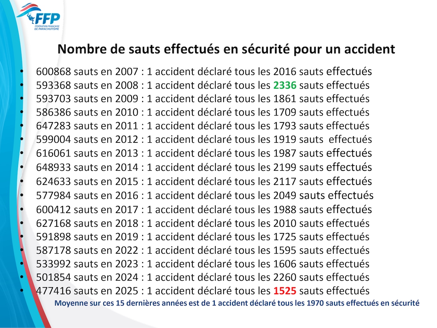En 2024, le ratio annuel entre le nombre de déclarations d'accidents et le nombre de licenciés accidentés, était le plus faible depuis une quinzaine d'années : 0,41% . En 2025, avec 313 déclarations d'accident pour 56.556 licenciés, il est remonté à 0,53% (voir schéma 1 ci-dessous). Même observation pour le ratio du nombre de sauts effectués en sécurité pour un accident qui est de un accident déclaré tous les 1525 sauts effectués sur un total de 477.416 sauts (voir schéma 2 ci-dessous, en 2008 : un accident déclaré tous les 2336 sauts effectués sur un total de 593.368 sauts).
