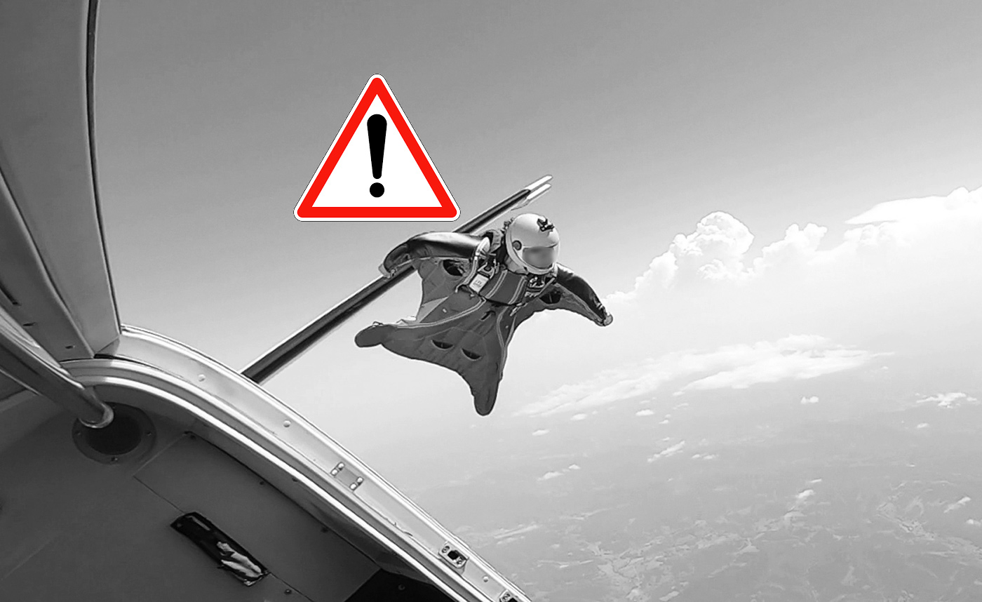 Ouverture intempestive en sortie d'avion durant un saut de groupe en wingsuit. Elle a été causée par une mauvaise mise en place en flotteur.