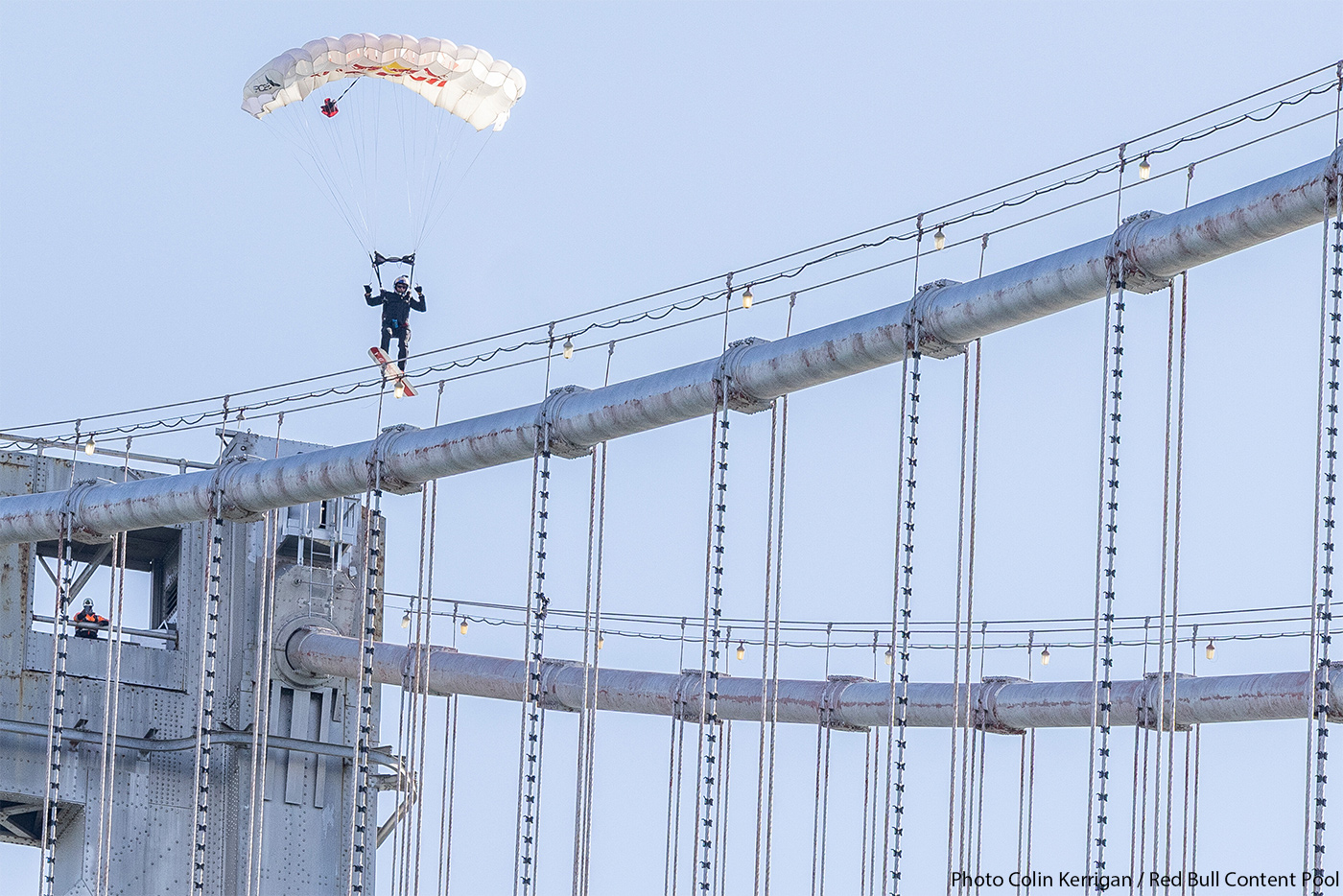 Équipé d'un skysurf, il a sauté d'un hélicoptère à 1.676 mètres d'altitude, ouvrant son parachute après une courte chute libre et il a aligné sa trajectoire vers le célèbre pont. Après avoir glissé le long des câbles avec sa planche de surf, il a atterri en toute sécurité sur une plateforme flottante installée dans la baie.