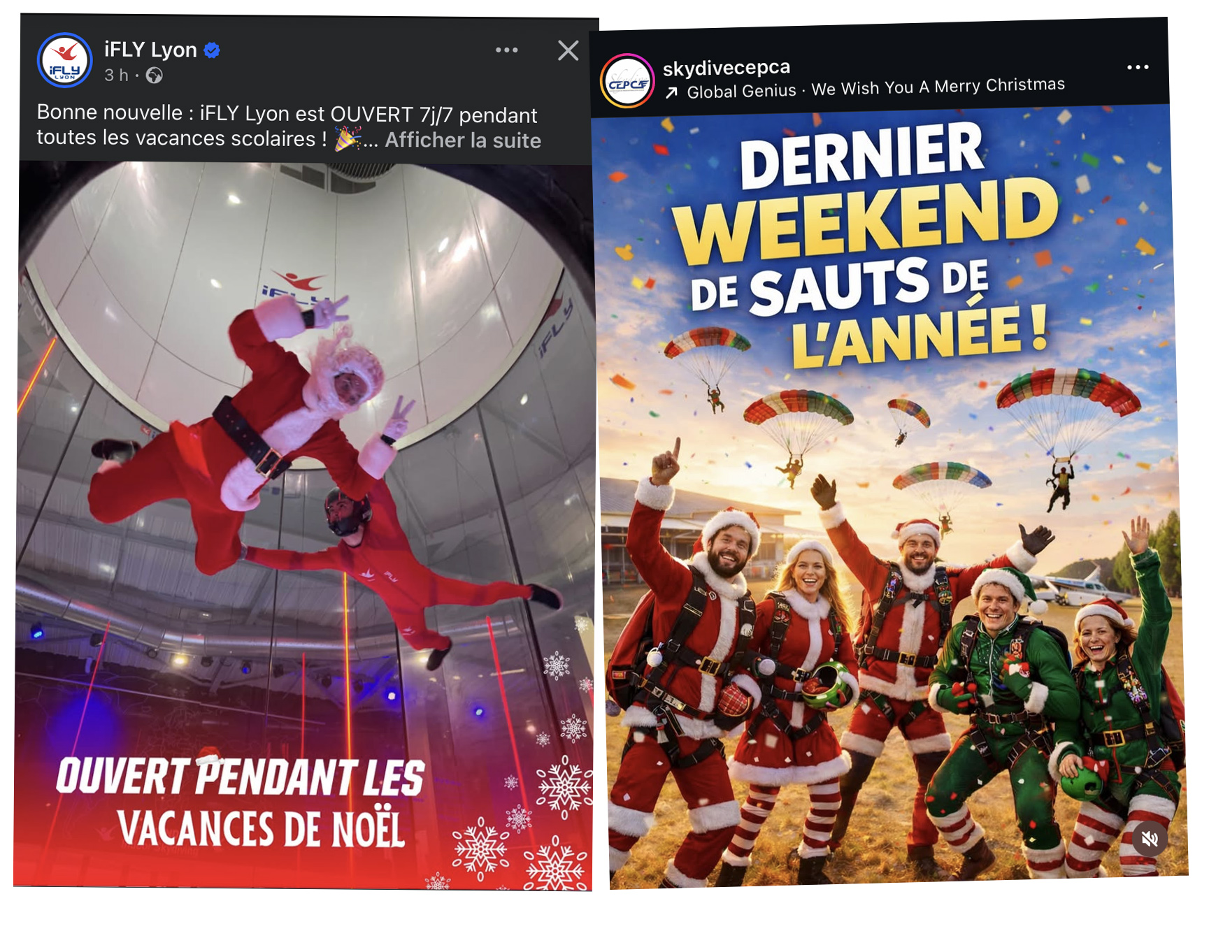 Visuel de gauche : entraînement en soufflerie pour le père Noël, chez iFly Lyon. A droite, avec les lutins, au Luc, Skydive CEPCA.