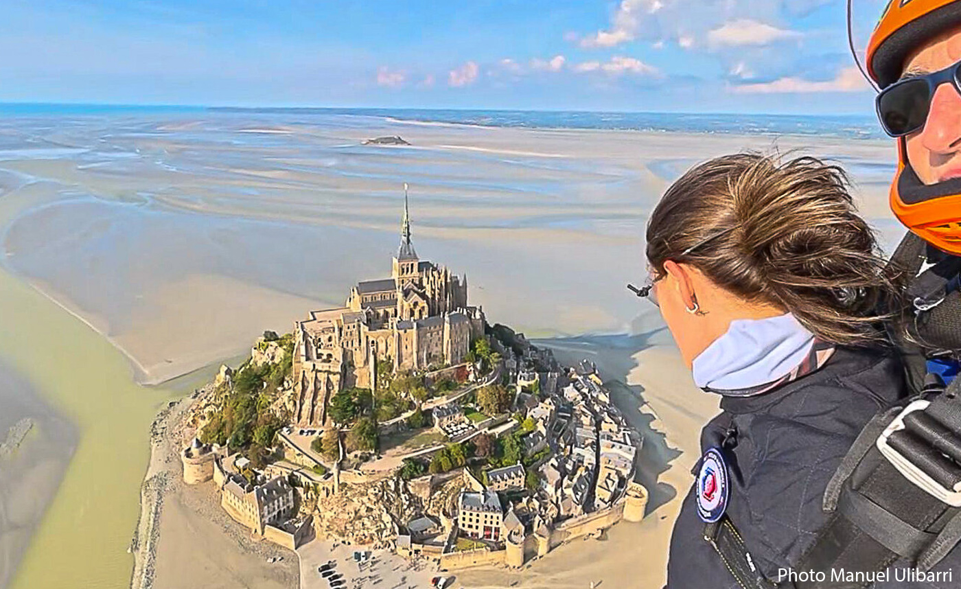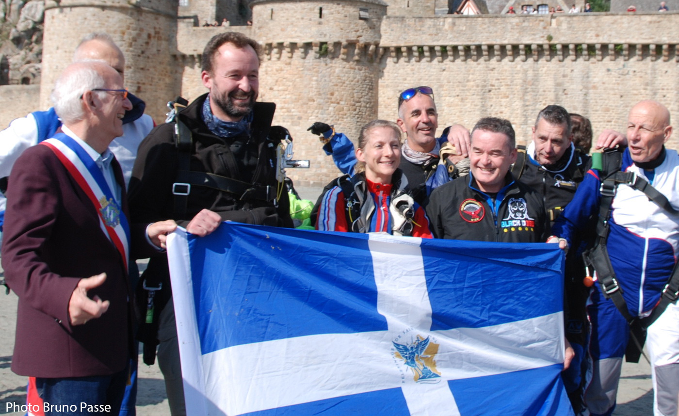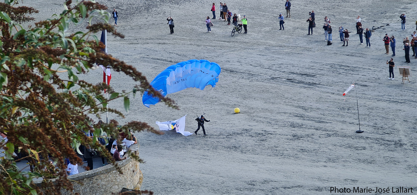 Bien sûr, dans ces deux rotations, se trouvaient aussi les trois parachutistes de précision ayant réalisé l'exploit du premier atterrissage sur la terrasse ouest de l’abbaye, le 8 mai dernier : Adeline Delecroix, Loïc Lubin et Franck Chartrain. Avec leurs voiles de précision d'atterrissage, porteurs de drapeaux, leur programme consistait à faire flotter tout autour du Mont-Saint-Michel les couleurs de :