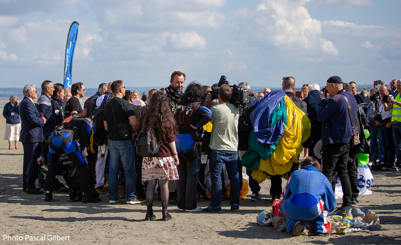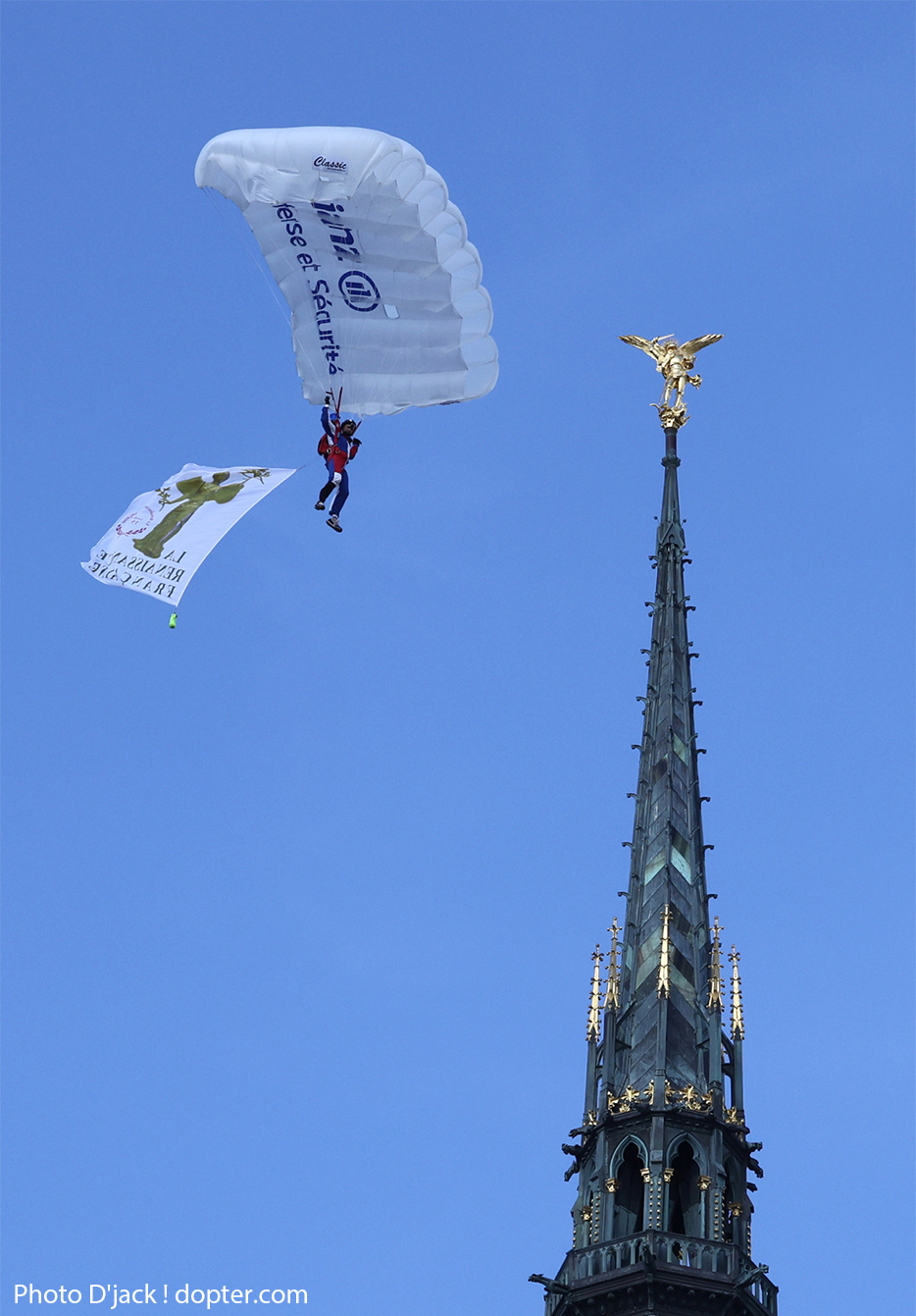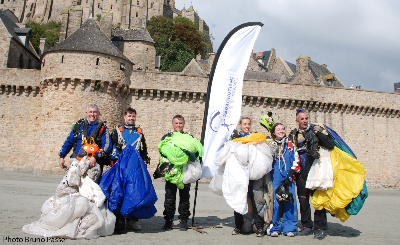 Bien sûr, dans ces deux rotations, se trouvaient aussi les trois parachutistes de précision ayant réalisé l'exploit du premier atterrissage sur la terrasse ouest de l’abbaye, le 8 mai dernier : Adeline Delecroix, Loïc Lubin et Franck Chartrain. Avec leurs voiles de précision d'atterrissage, porteurs de drapeaux, leur programme consistait à faire flotter tout autour du Mont-Saint-Michel les couleurs de :