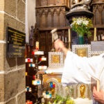 - Dans l’église Saint-Pierre, le Père Don Pierre Doat bénit la plaque nominative des quatre parachutistes qui se sont posés en première mondiale sur la terrasse ouest du Mont-Saint-Michel. Photo Pascal Gilbert