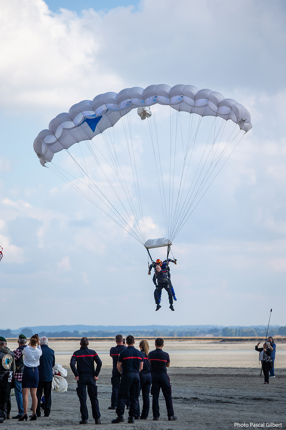 Ensuite ce fut le tour des tandems, dont certains en configuration handy, et c'était la "séquence émotion" de l'événement qui consistait à faire découvrir le parachutisme et la chute libre à des néophytes, le jour de la Saint-Michel et au plus près du Mont-Saint-Michel. C'était aussi un grand moment pour les parachutistes confirmés, comme le prouvaient les larmes de joie de Chloé Chapalain et Albin Serrand, après leur atterrissage.