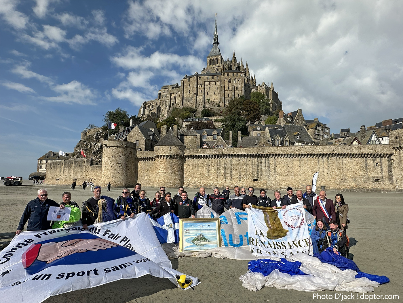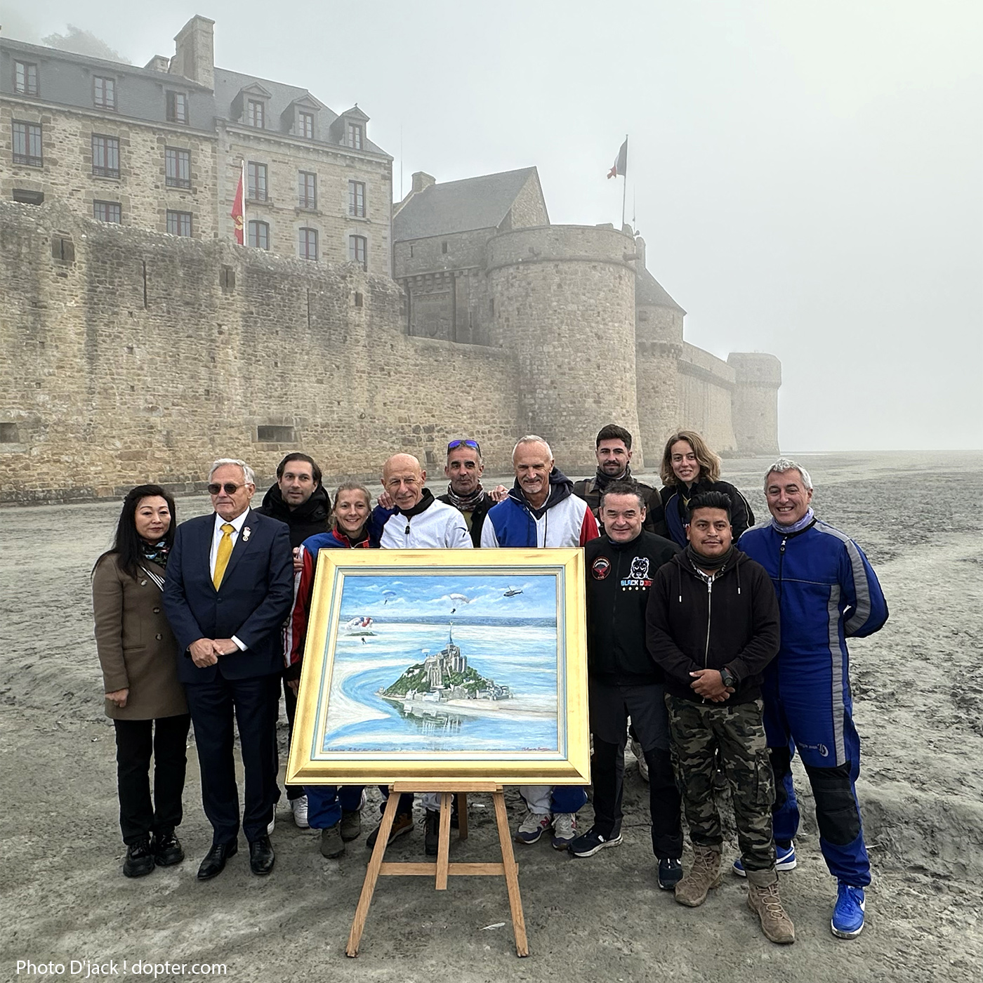 Elle a également revêtu une dimension mémorielle en rappelant l’exploit exceptionnel du 8 mai 2025, lorsque les quatre parachutistes Mario, Adeline, Franck et Loïc ont accompli ce saut historique sur la terrasse ouest de l’abbaye du Mont-Saint-Michel. Vos noms resteront à jamais gravés sur la plaque inaugurée dans l’église Saint-Pierre. Un souvenir vibrant qui donne encore plus de sens à notre aventure commune.