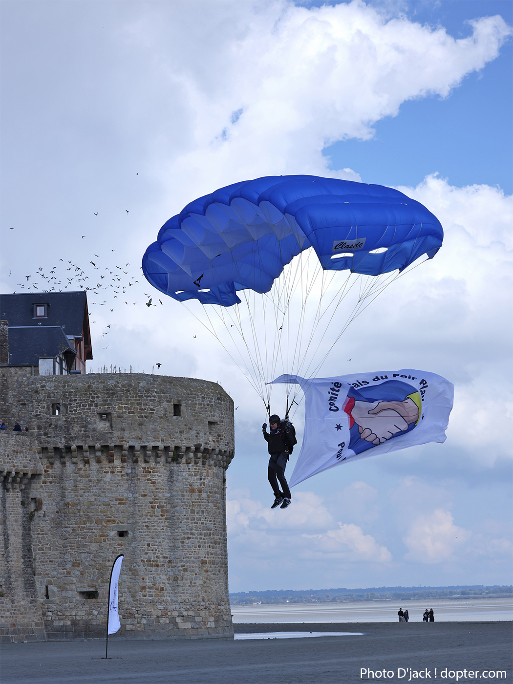 Quoi de mieux qu'un premier largage de parachutistes, avec atterrissage près des remparts du mont Saint-Michel, pour démarrer cette journée de l'opération Mont-Saint-Michel ? C'est ce qui était prévu, dès 9 heures du matin et avec l'apport technique de l'École de parachutisme sportif de Vannes-Bretagne et de la FFP.