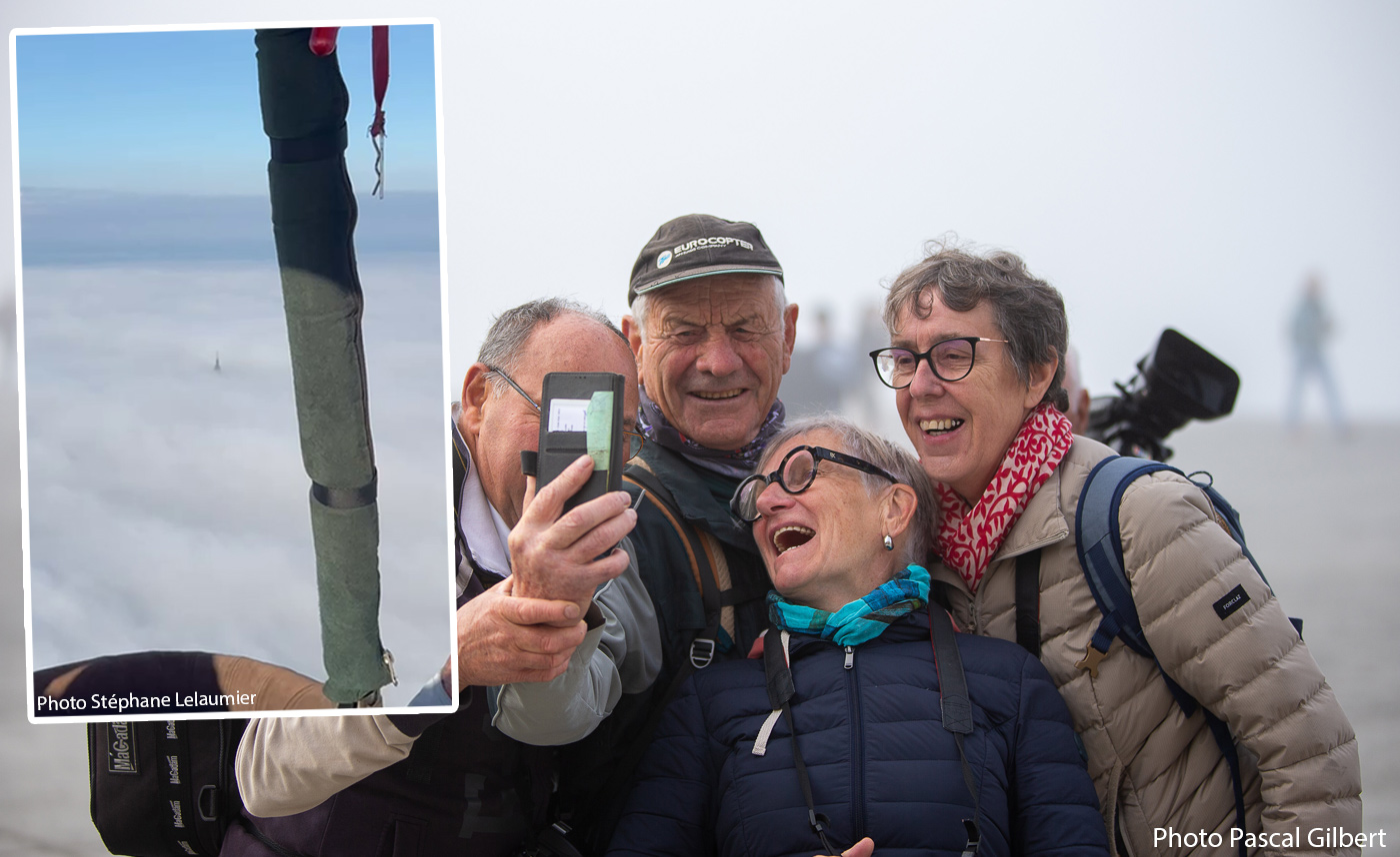 En attendant que la brume se lève… Au pied du Mont-Saint-Michel, on ne voit pas l'Archange, mais les copains qui sont en vol dans le ballon téléphonent et envoient l'image de la statue qui dépasse de la couche.