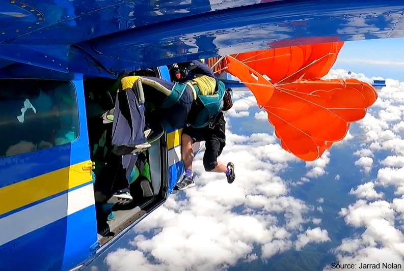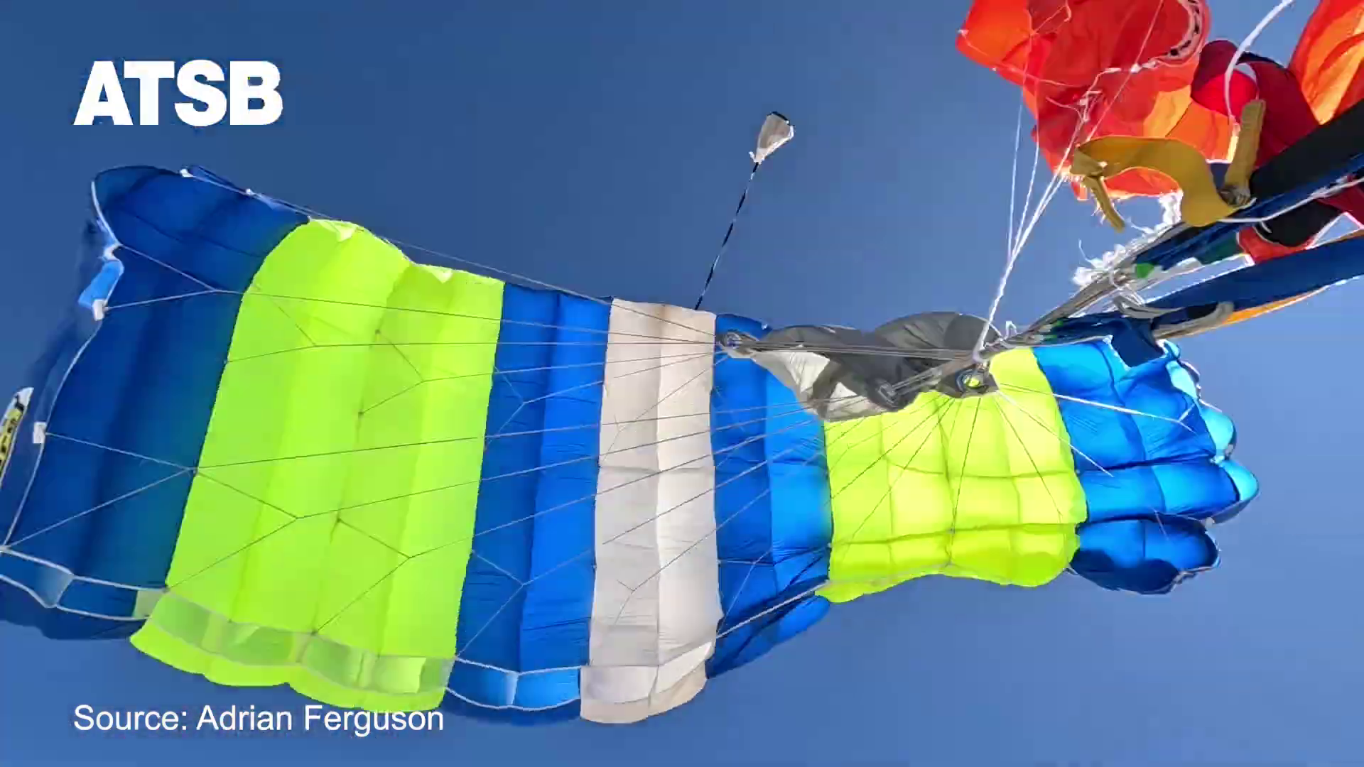 Une fois en chute libre, le parachutiste a déclenché l'ouverture de son parachute principal. Bien que partiellement emmêlée avec ce qui restait de sa voile de secours, sa voile principale se comportait assez bien. Le parachutiste a pu atterrir en sécurité, ne subissant que de légères blessures.