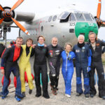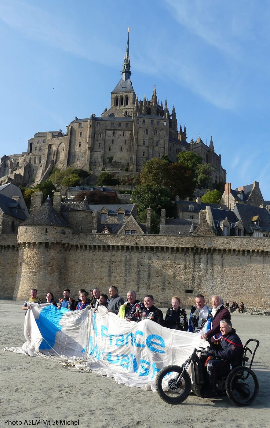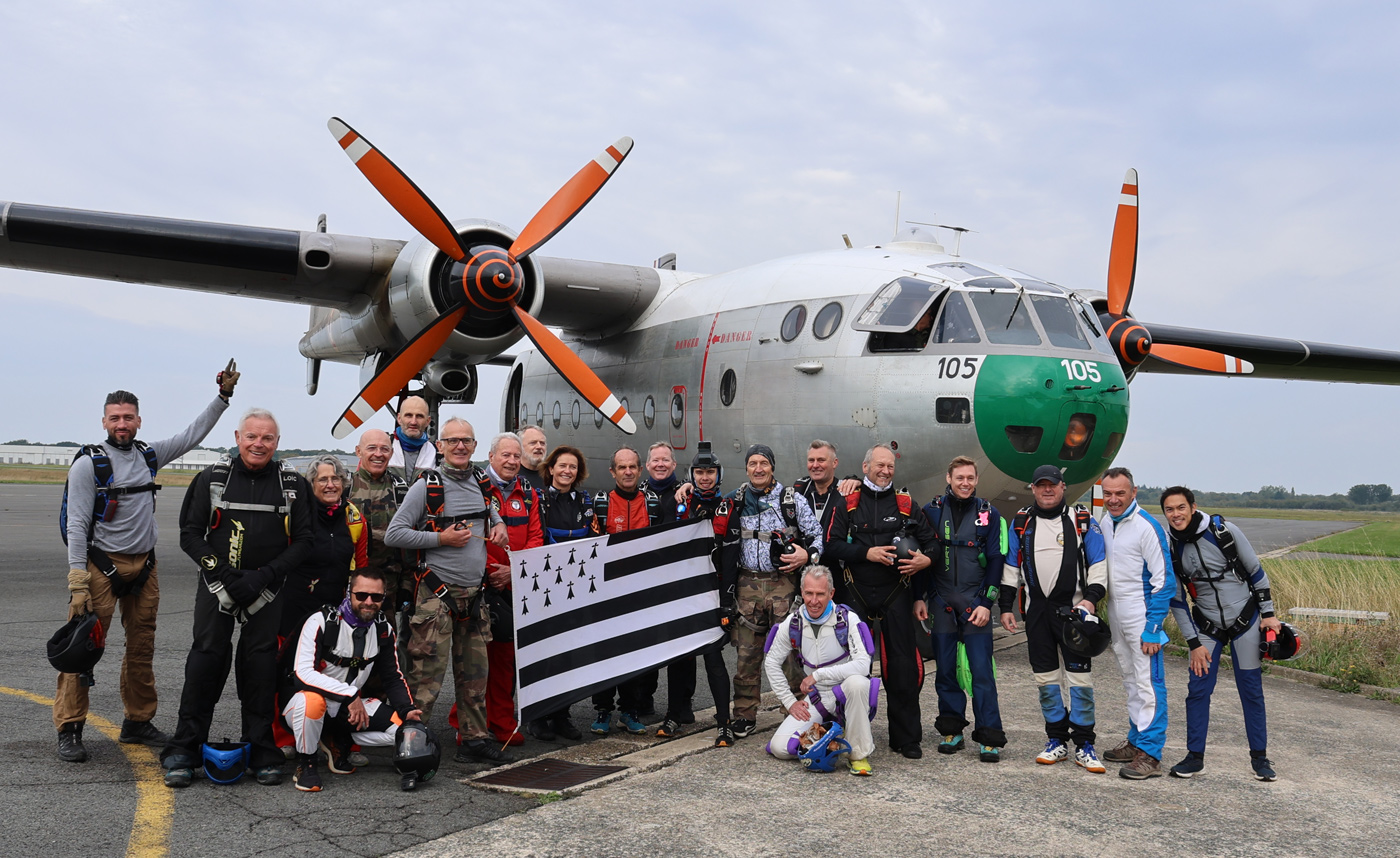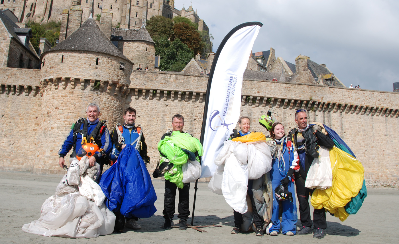 Une partie des sautants du deuxième avion pose avec la voile la France Mutualiste, un des partenaires de l'opération Mont-Saint-Michel, le 29 septembre 2025. Photo ASLM Mont Saint Michel