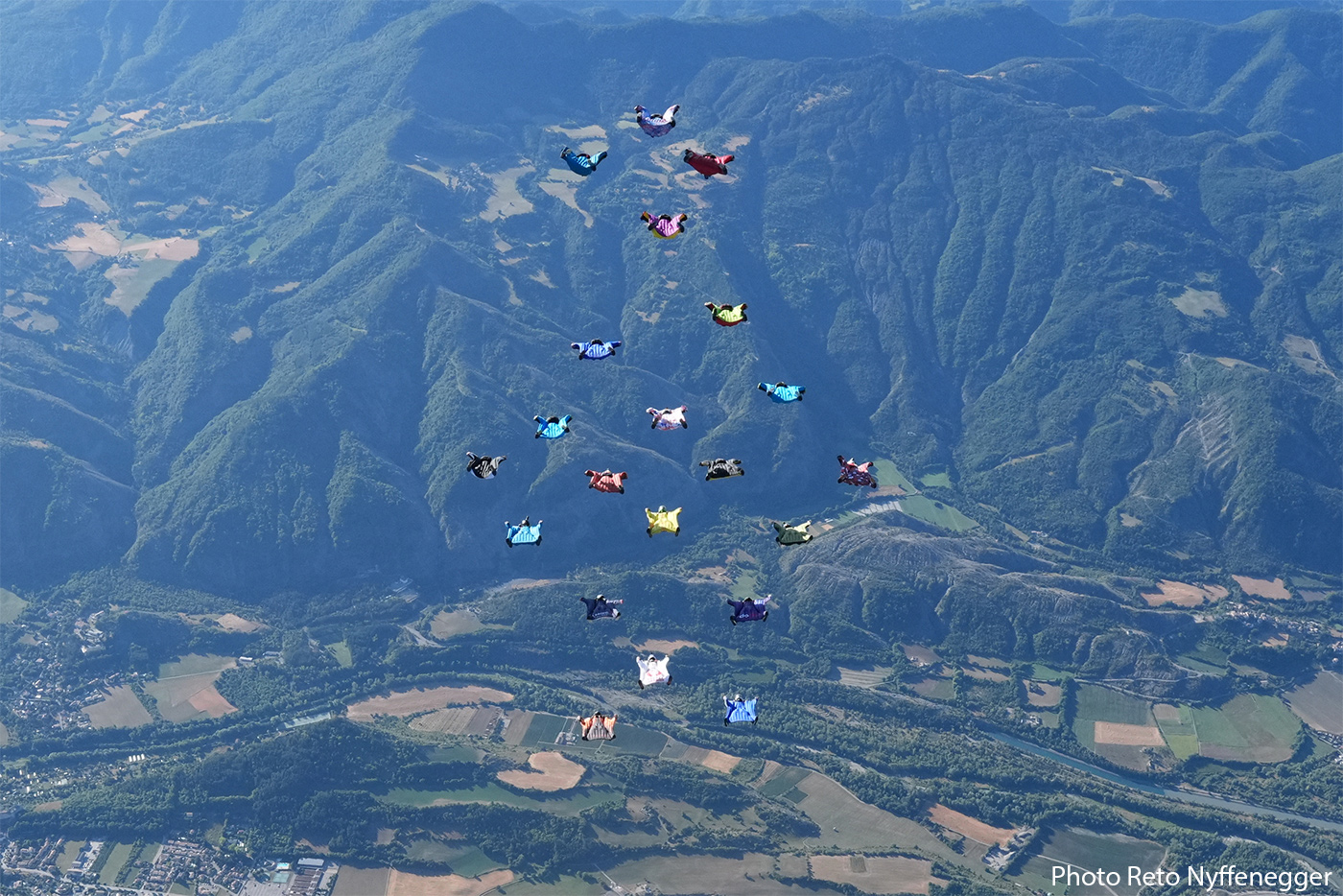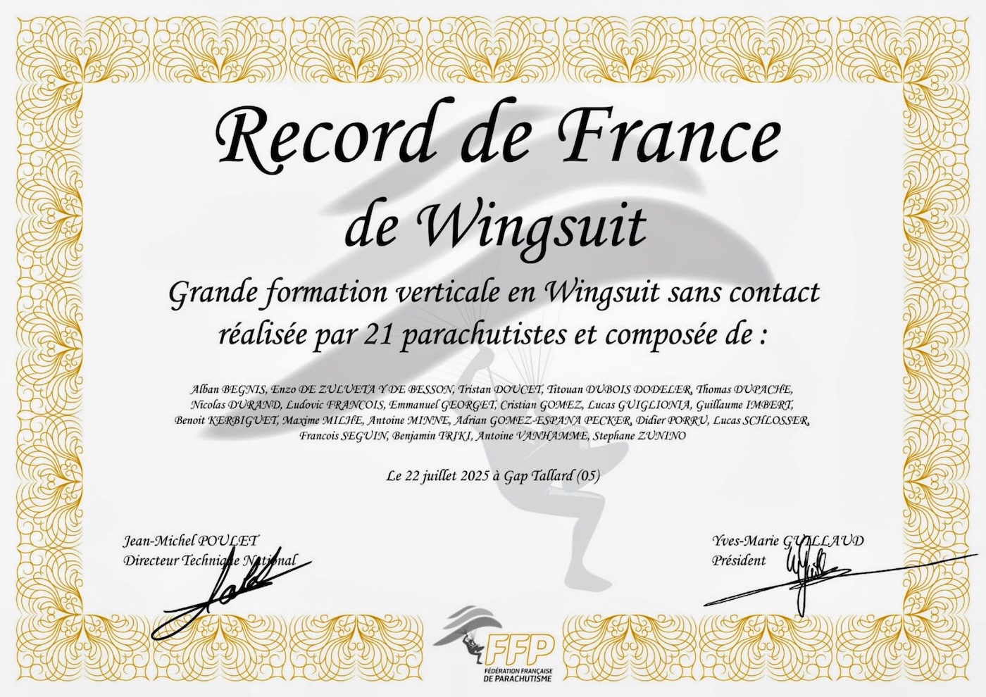 Retour sur un des évènements de l'été 2025... Le mercredi 23 juillet, au CERPS Gap-Tallard, un double record de France et d'Europe était établi avec une grande formation verticale sans contact à 21 en wingsuit, organisée par Stéphane Zunino. Ce record venait battre celui qui avait été établi à 16, le jour précédent, par la même équipe.