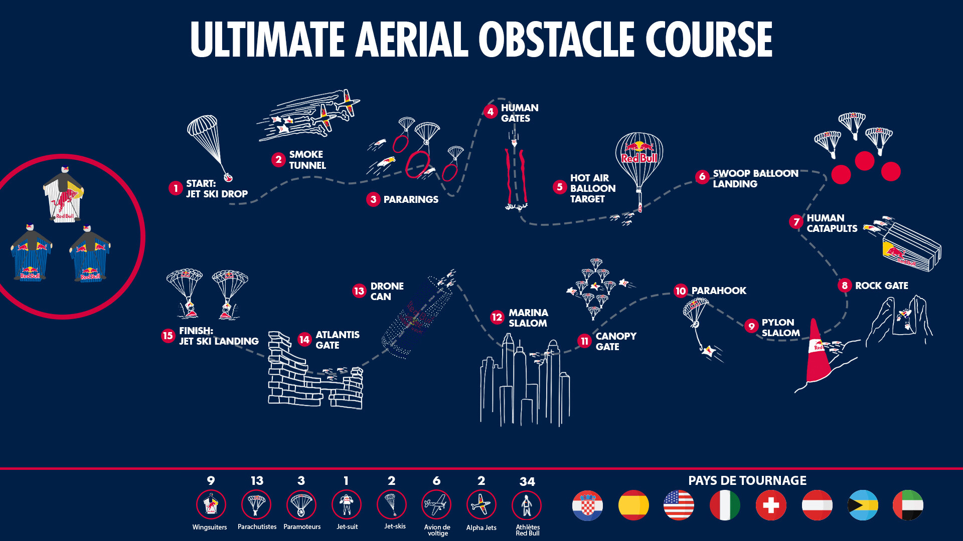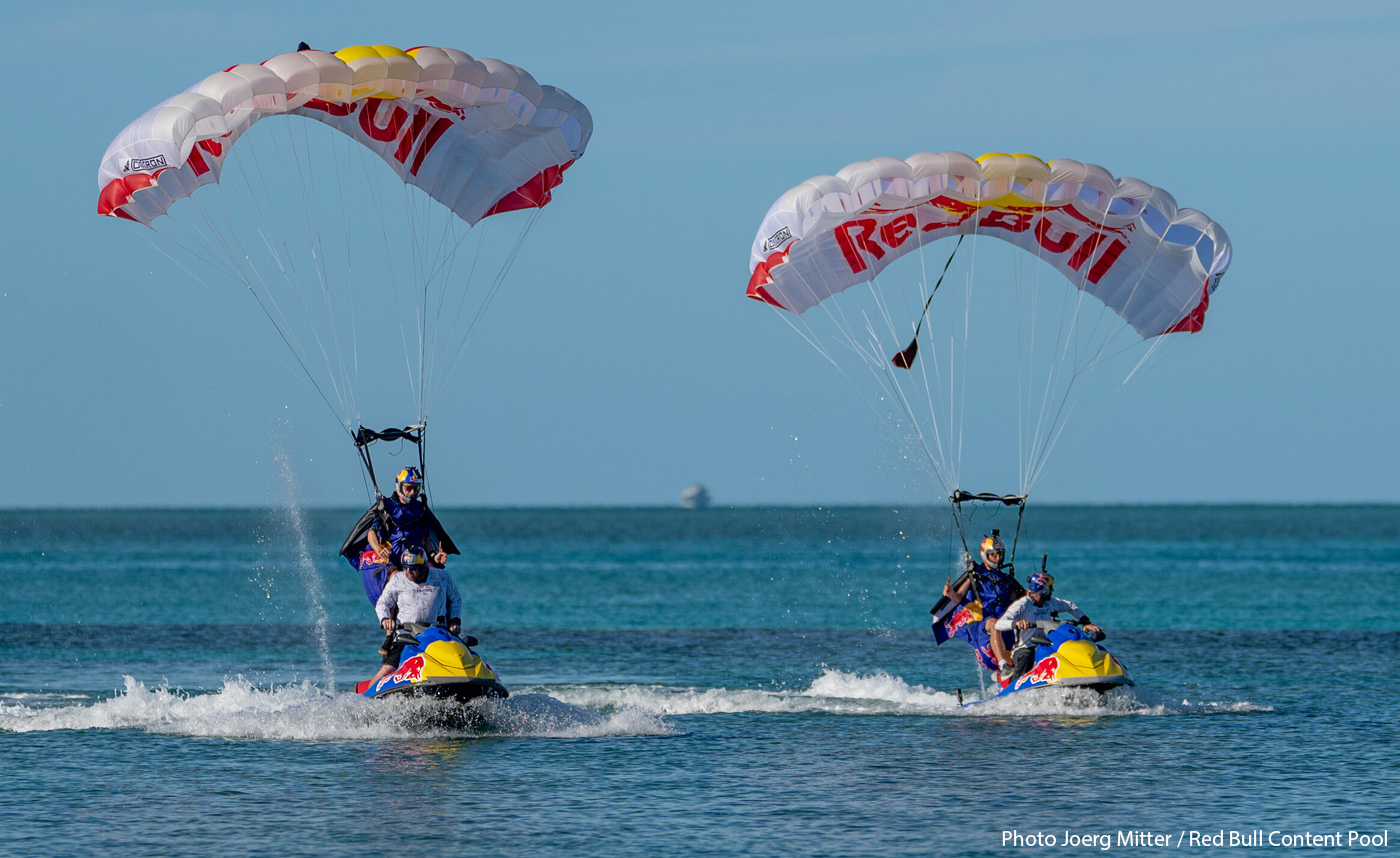15. Arrivée : Jet Ski Landing (PA sur Jet Ski) – West End, Bahamas : Marco Fürst et Max Manow descendent sous leurs parachutes pour atterrir sur des jet-skis en mouvement, rejoints quelques instants plus tard par d'autres pilotes, dont Issa Kalfon en jet-suit, et des avions de voltige, pour la séquence de clôture.