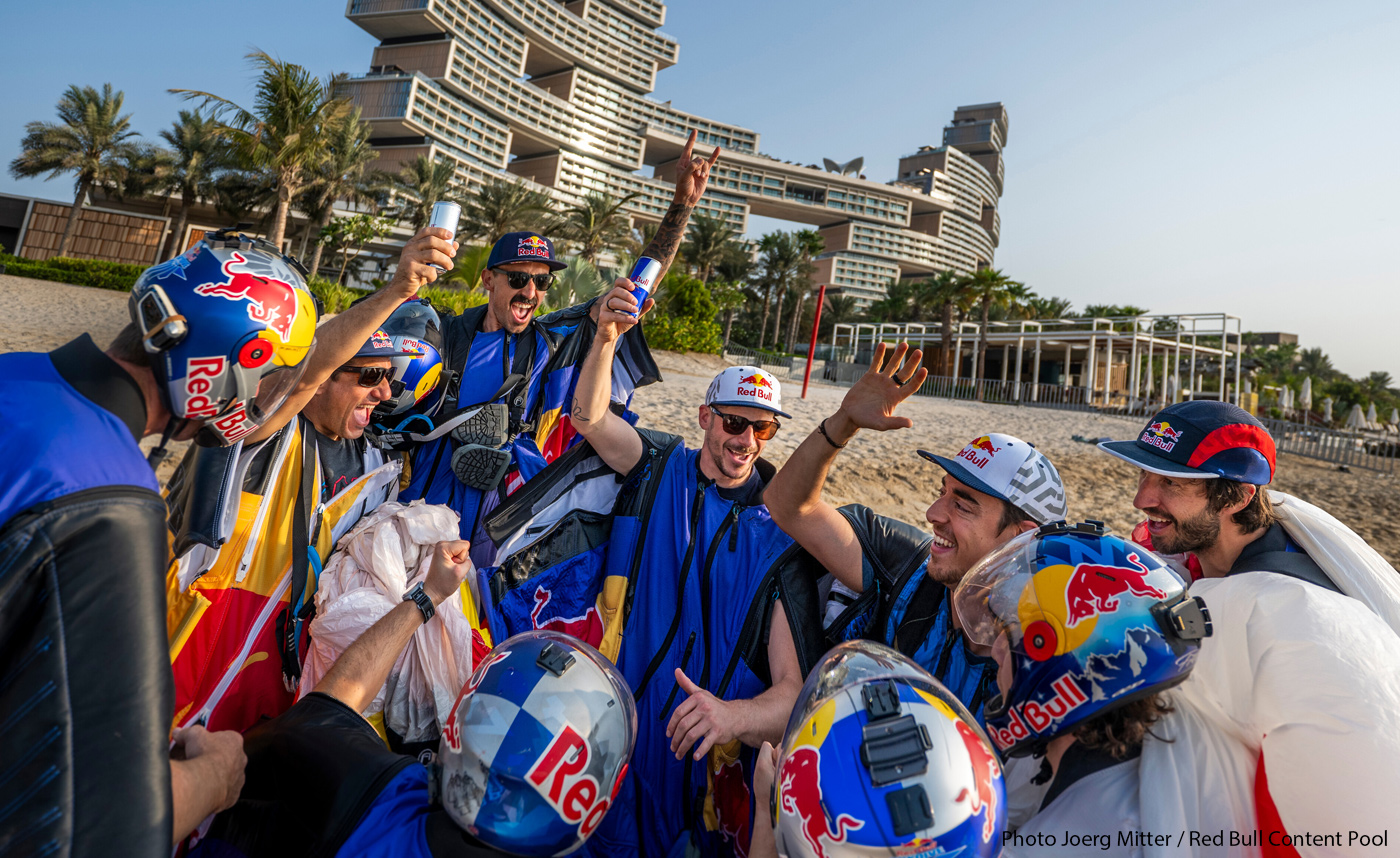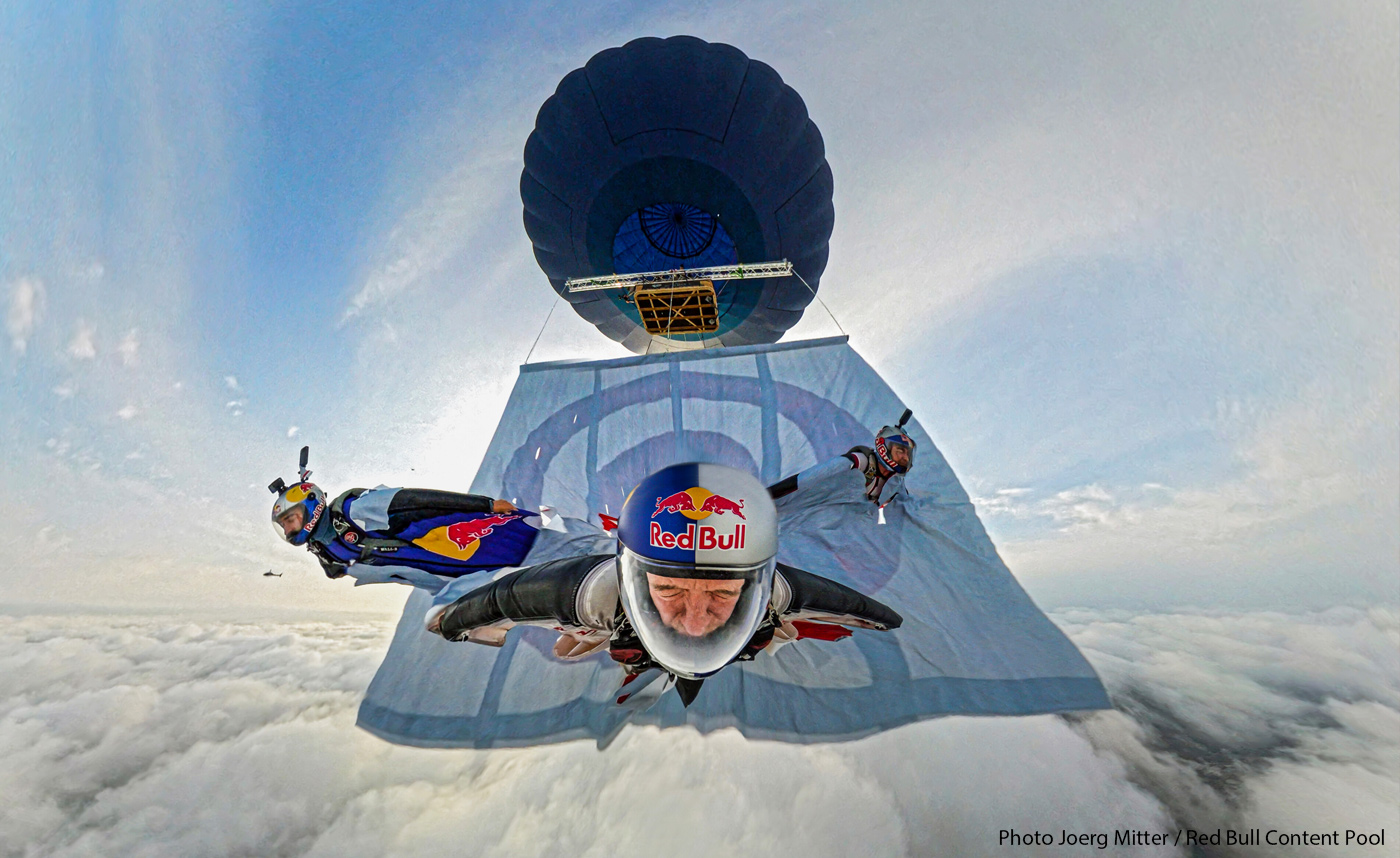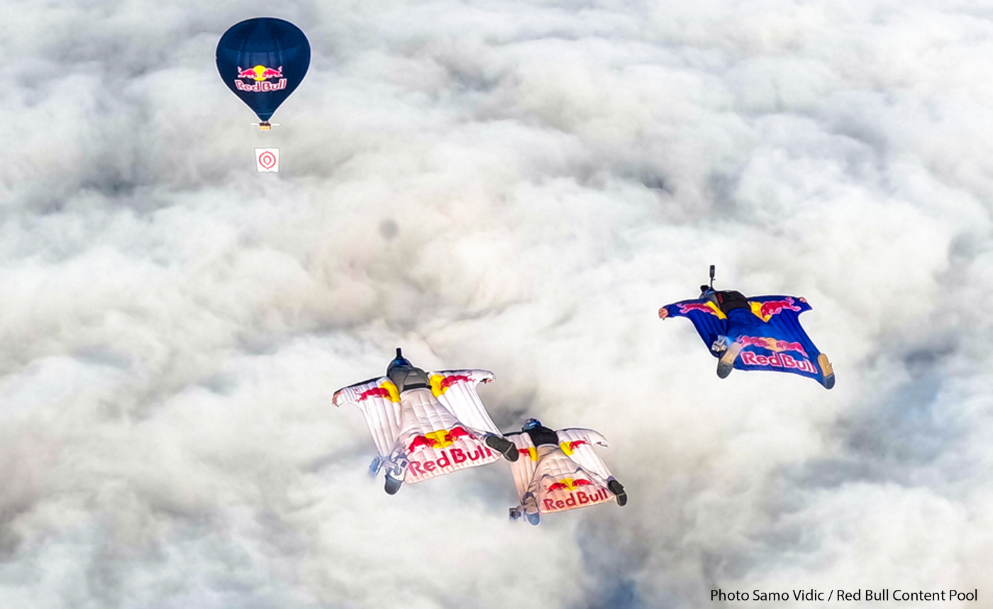 Légende photo ci-dessus : Mike Swanson, Marko Waltenspiel et Dani Roman viennent de traverser la cible accrochée sous un ballon, à Manresa, Espagne. Légende photo d'intro : Marco Fürst, Marco Waltenspiel et Max Manow traversent une formation de drones en forme de canette Red Bull géante. L'illustration est une photocomposition de plusieurs images, afin de bien visualiser l'intégralité de l'action, qui s'est déroulée à Dubaï.
