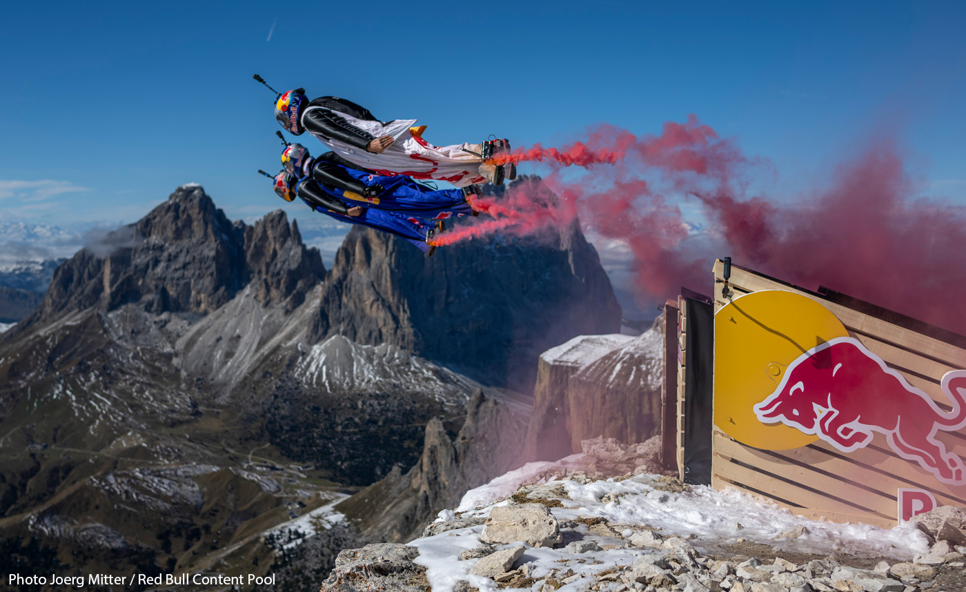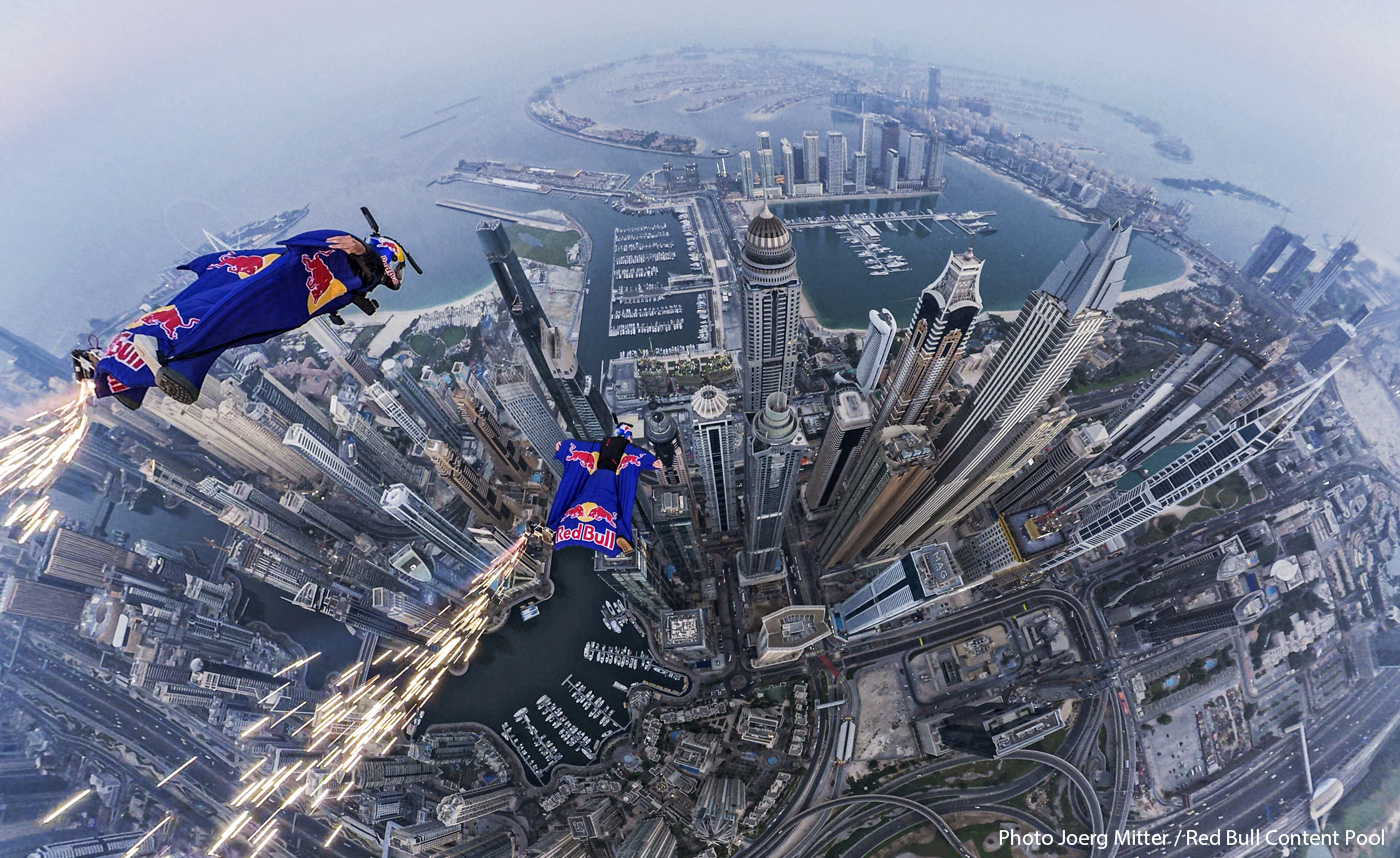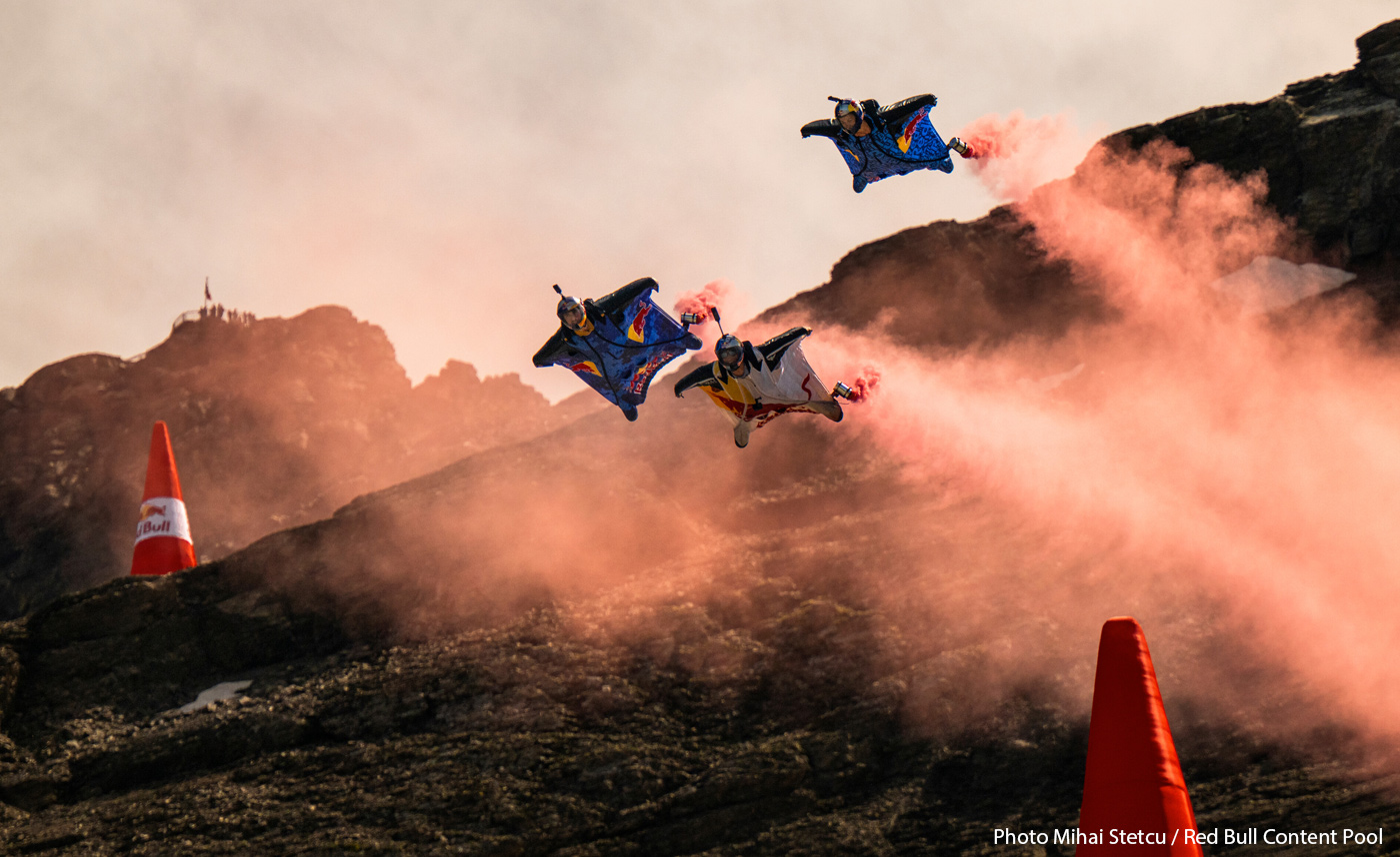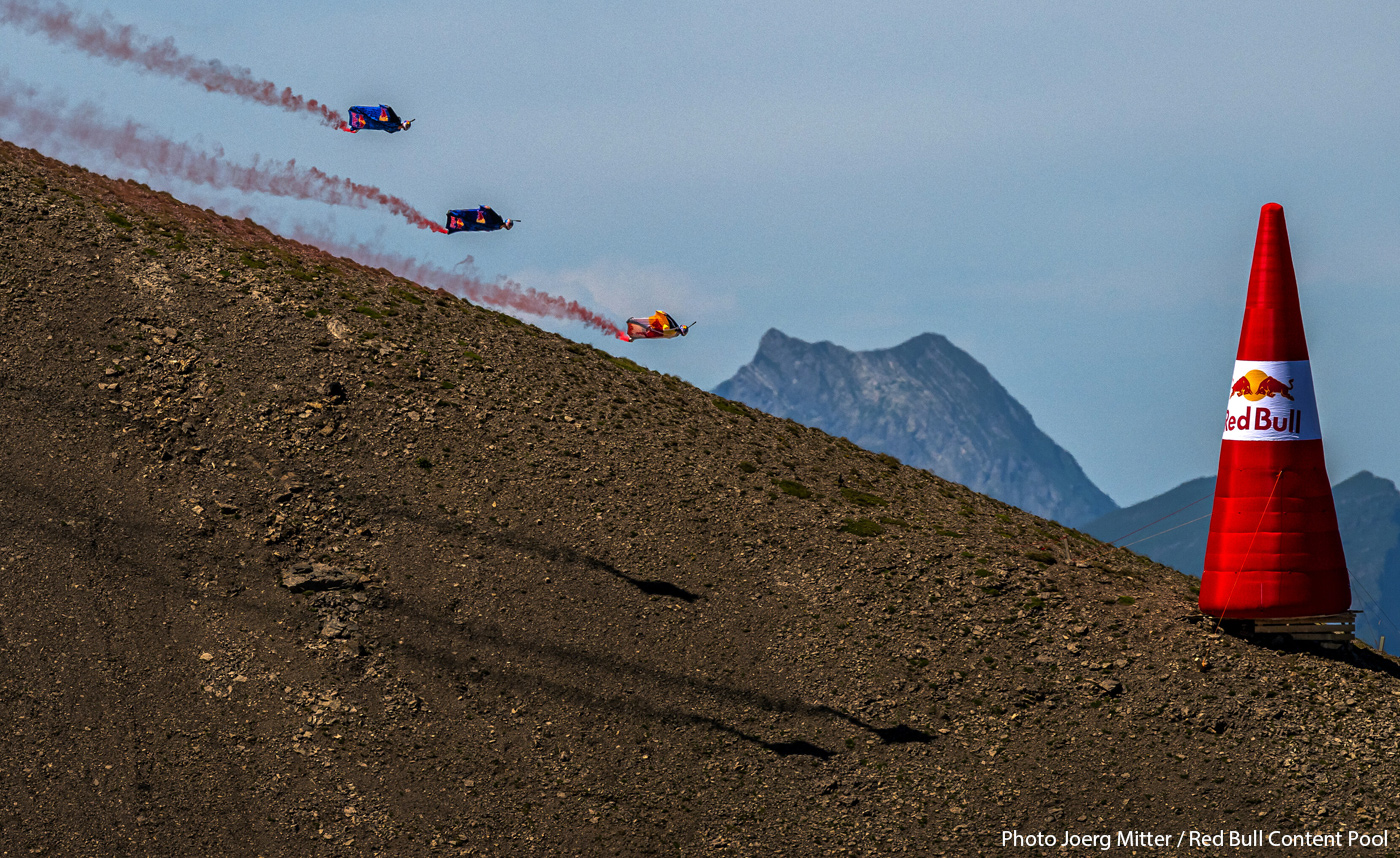 Légende photo ci-dessus : Mike Swanson, Marko Waltenspiel et Dani Roman viennent de traverser la cible accrochée sous un ballon, à Manresa, Espagne. Légende photo d'intro : Marco Fürst, Marco Waltenspiel et Max Manow traversent une formation de drones en forme de canette Red Bull géante. L'illustration est une photocomposition de plusieurs images, afin de bien visualiser l'intégralité de l'action, qui s'est déroulée à Dubaï.