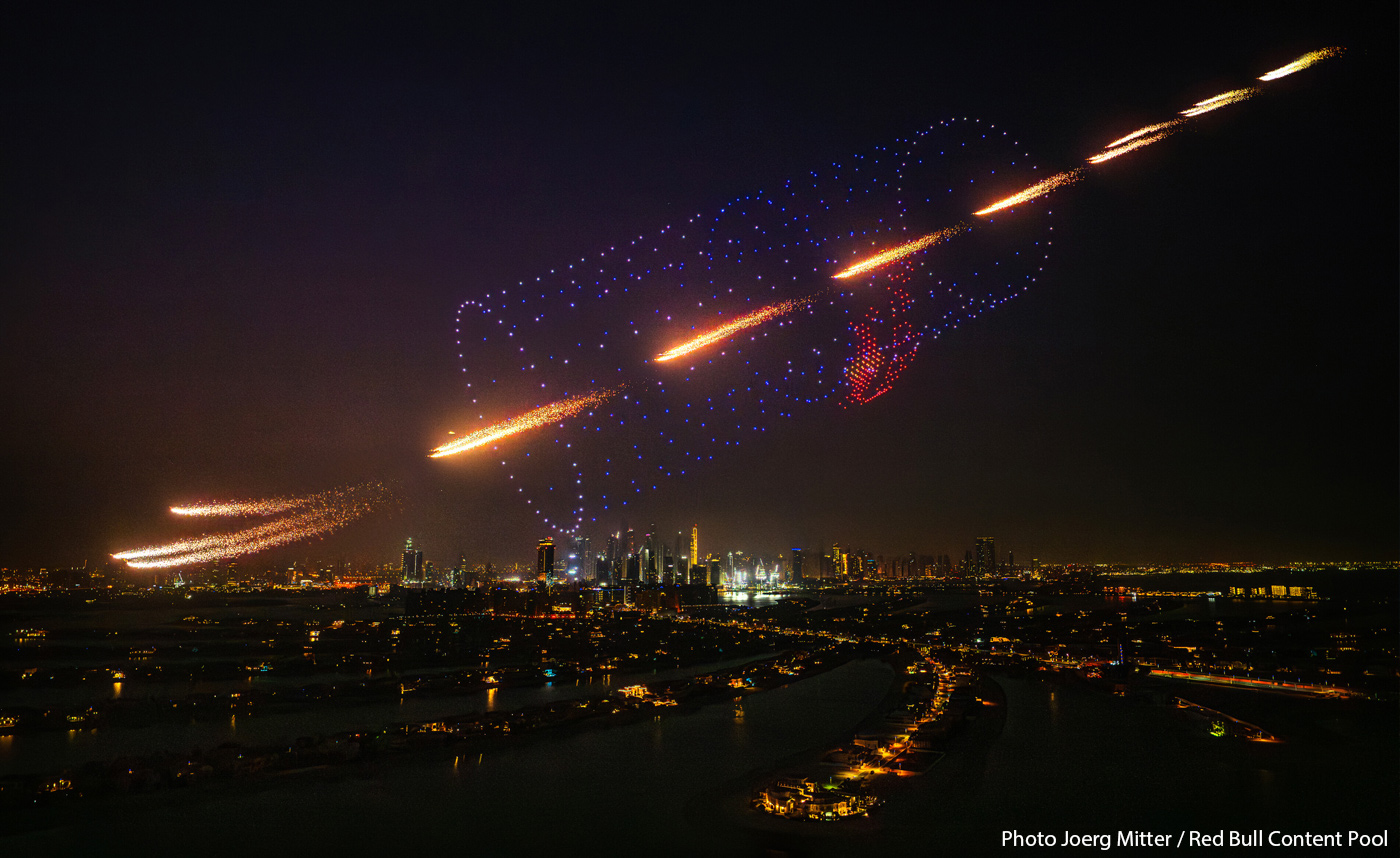 La séquence Red Bull Drone Can a nécessité la mise au point de protocoles aériens spécifiques. "Réunir des parachutistes, des drones, des feux d'artifice... C'était un projet très ambitieux, tant sur le plan technique qu'en termes de hauteur d'évolution", explique Muyassar Abulkhair, PDG de Skyvertise. "Peut-être qu'un jour, nous verrons naître un nouveau sport".