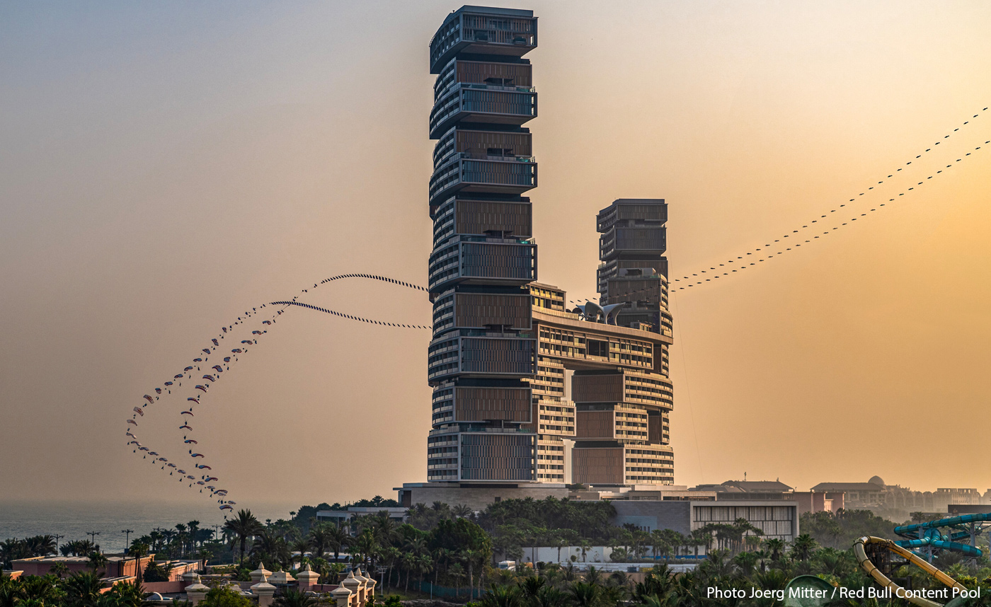 14. Atlantis Gate (Porte de l'Atlantis) – Dubaï, Émirats arabes unis : Marco Waltenspiel, Marco Fürst et Max Manow volent en wingsuit à proximité du Royal Atlantis, puis ils ouvrent leurs parachutes, donnant à la scène un style cinématographique.